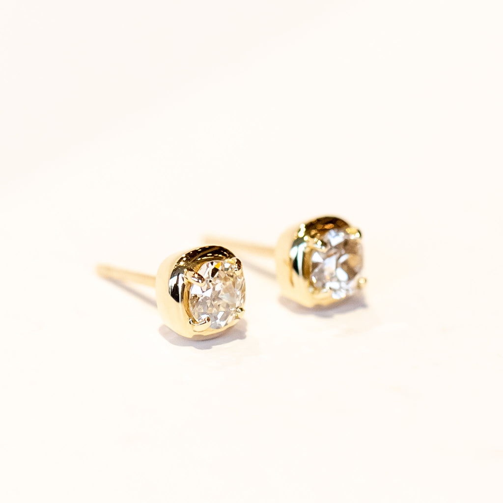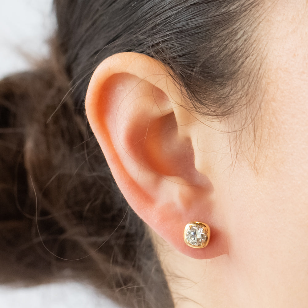 We're obsessed with the effortless shine of these diamond stud earrings. Set in polished 18k yellow gold, the cushion-like settings cradle two old European cut diamonds that radiate with vintage charm and modern brilliance. Their low-profile prong design gives them a fresh, contemporary feel, while the classic sparkle keeps them eternally stylish. Wear them solo for a refined statement or mix them into your ear stack for a chic, layered vibe.