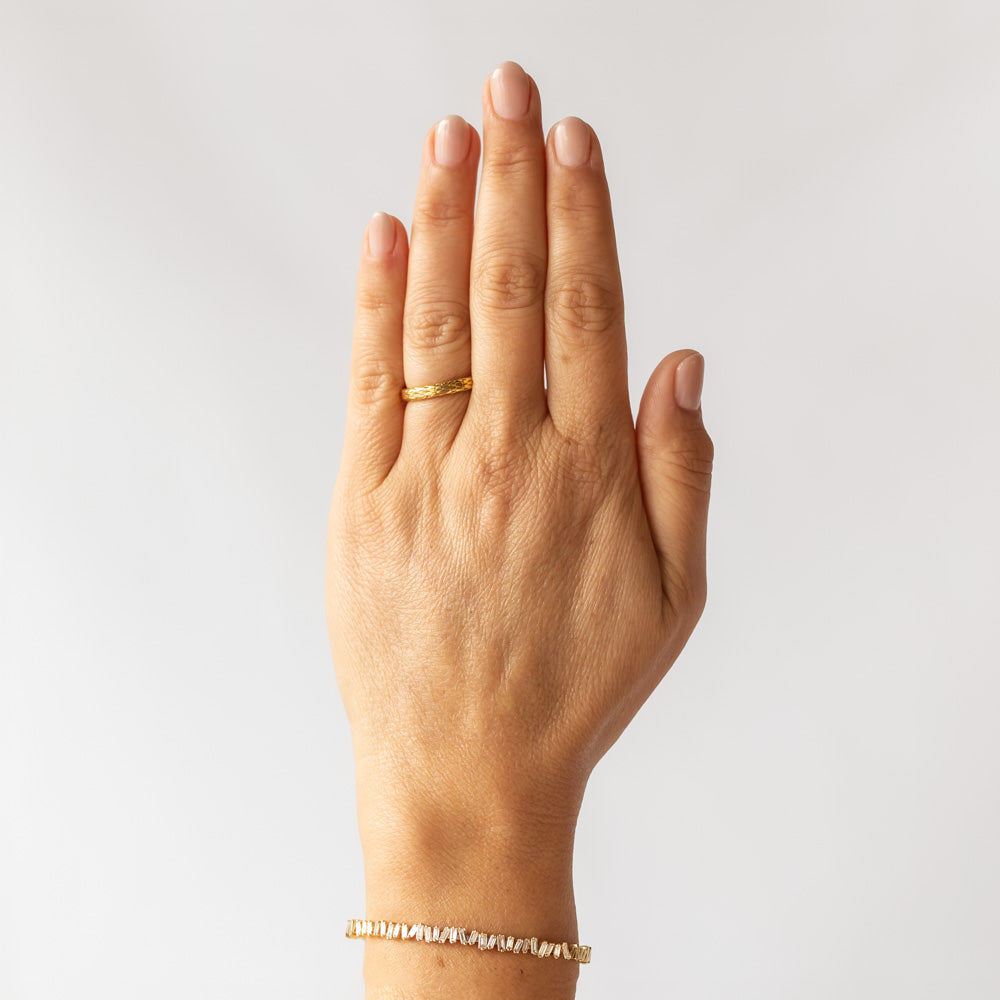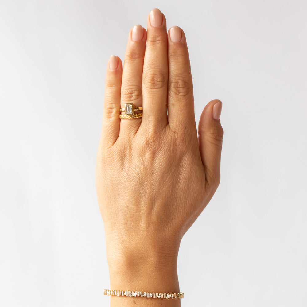 Echoing the tales of Eden, this chunky gold band from Single Stone is handcrafted in bright 18 karat yellow gold with snakeskin scale engraving all the way around, including the sides of the band. The smooth surface is slightly oxidized to create contrast within the pattern. You can wear the Eden band on its own as a statement piece, or add some edge to your ring stack.