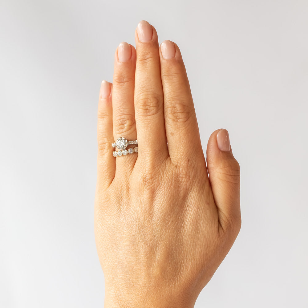 This Gabby band really doesn't quit. Set in handcrafted 18 karat white gold, an endless row of brilliant old European cut diamonds are each surrounded by milgrain detailed bezels. It's a timeless style eternity ring that makes the wedding band accompaniment to any engagement ring, plays well with others as a stacking ring, or stands out as a solo statement piece. This style is not rhodium plated so the white gold can show off its natural pale champagne hue.