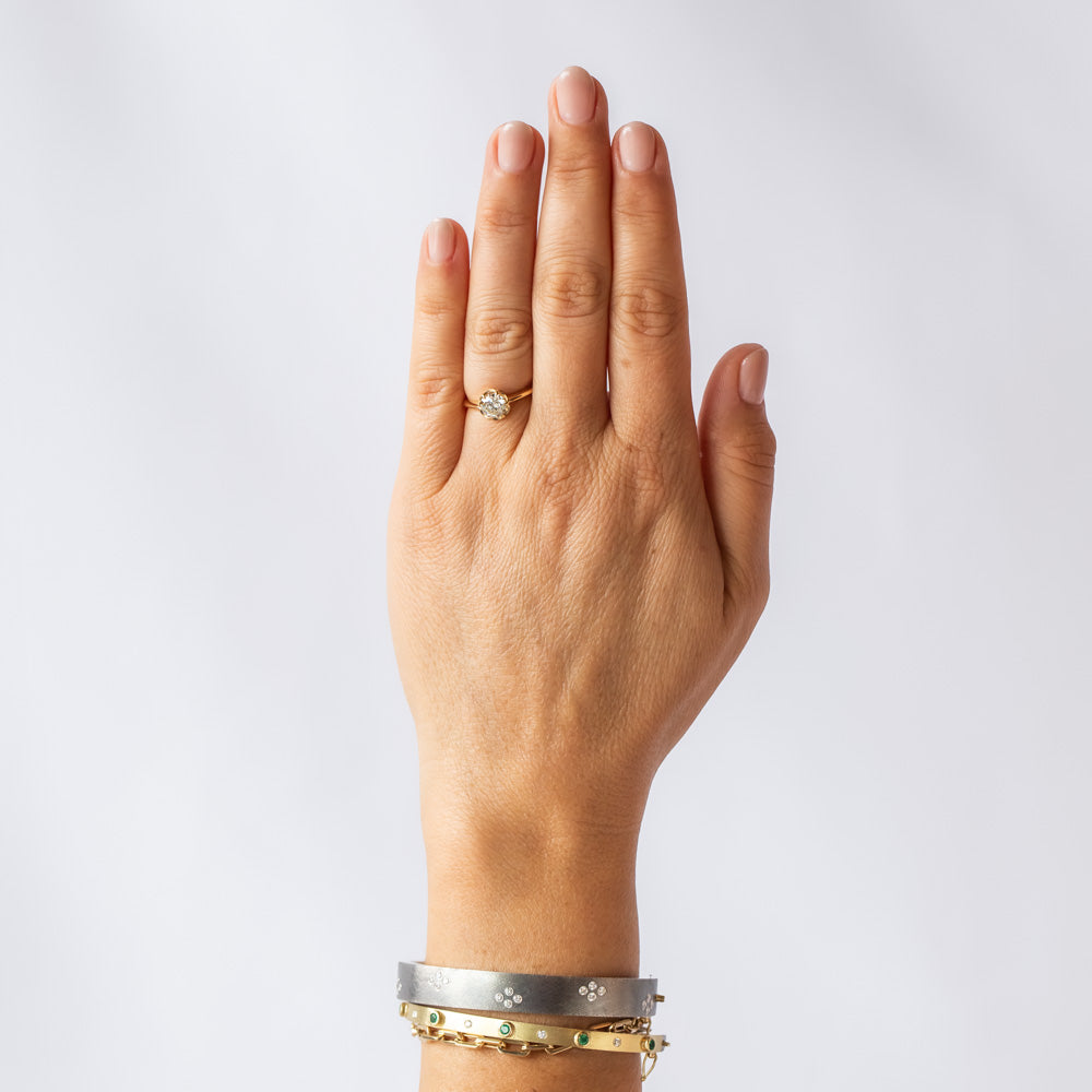 Need an engagement ring fit for royalty? Single Stone's handcrafted Josilyn solitaire might fit the bill. She's got a brilliant old European cut diamond at her center, held in a 6-prong 18 karat yellow gold setting shaped like a crown. This diamond ring sits super low profile on your finger, which makes her perfect for active lifestyles. Pair with your choice of wedding band for a super cute ring stack.