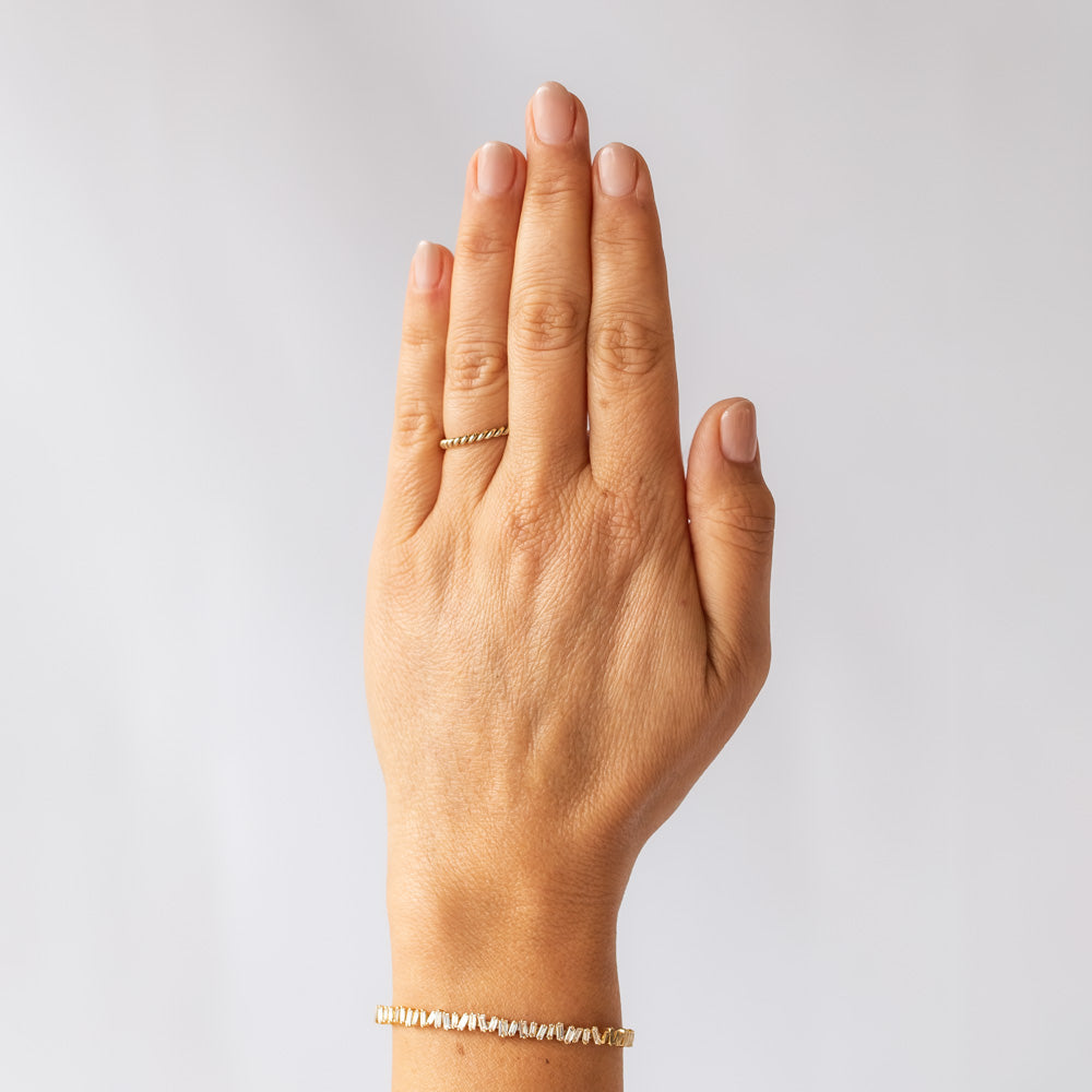 For lovers of classic design, the Lara band from Single Stone is a perfect wedding band choice. Handcrafted from twisted strands of 18 karat white gold, this demurely-sized ring works well as a stacking ring, worn with your engagement ring, or on its own for a bit of texture.
