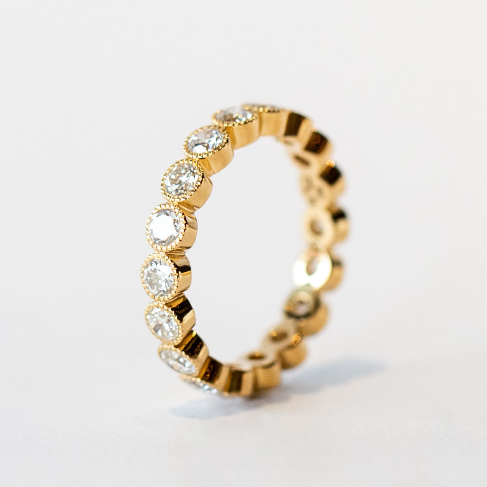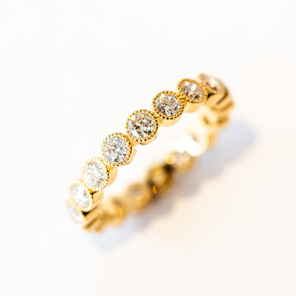 The Medium Gabby Band is the perfect mix of vintage charm and modern elegance. Featuring old European cut diamonds bezel-set into a neverending eternity band, the diamonds are surrounded by delicate milgrain edges that add a subtle touch of texture. Crafted in 18k yellow gold, this ring exudes understated luxury with a timeless feel.