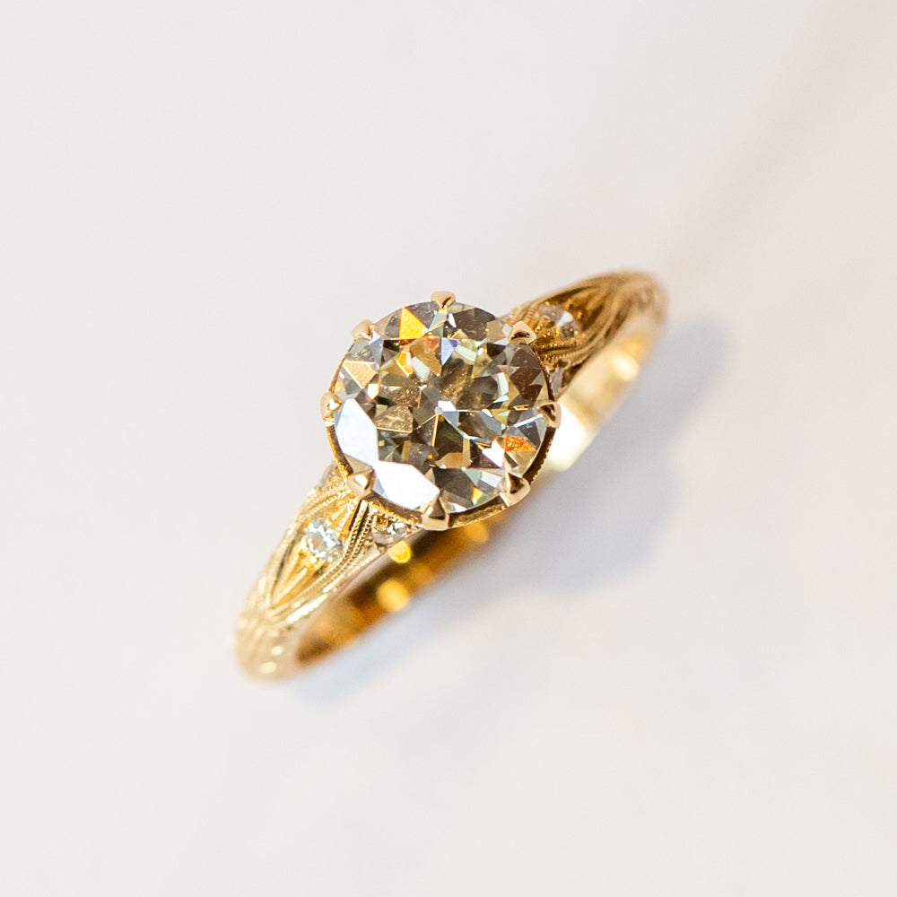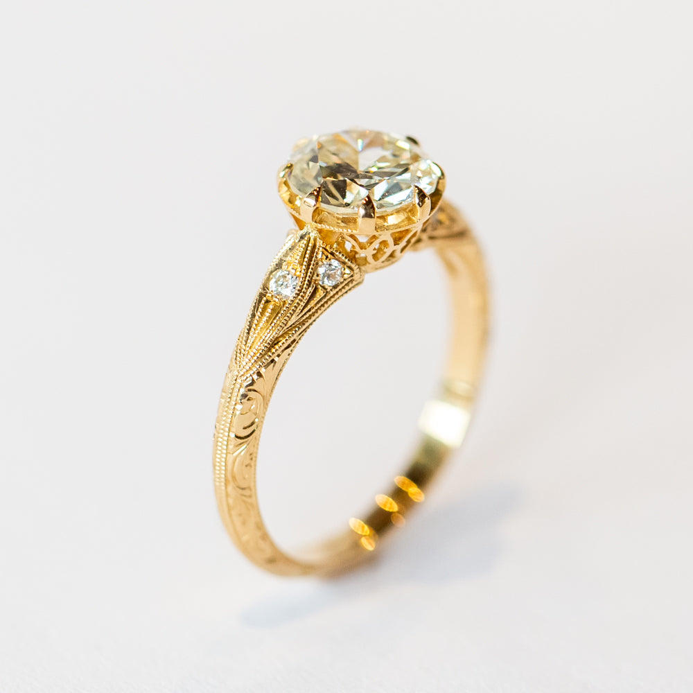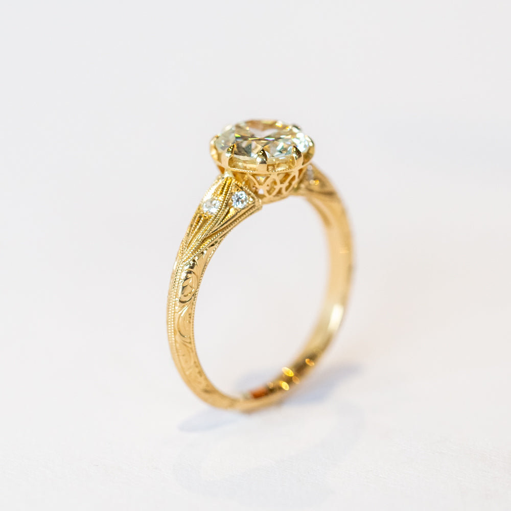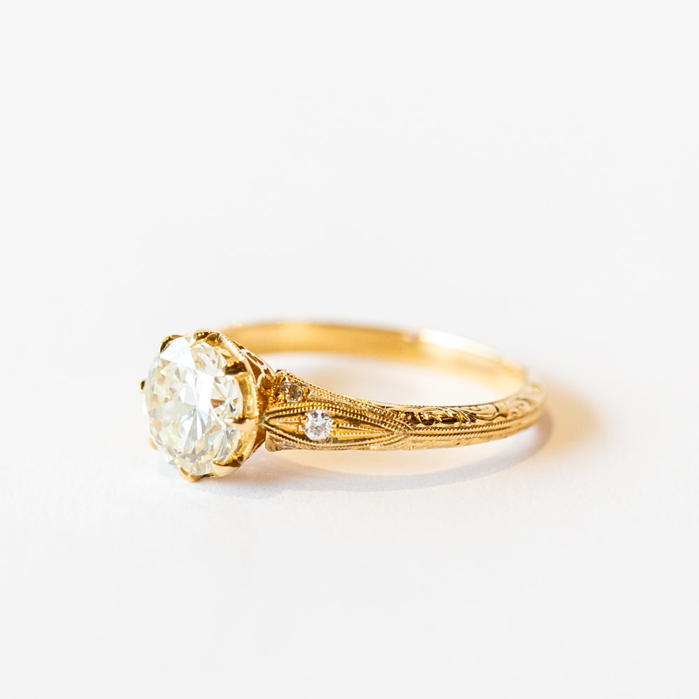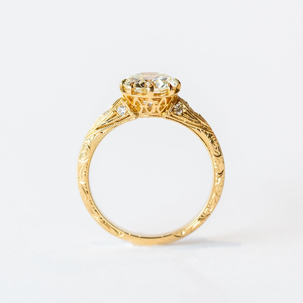 Fit for royalty, Single Stone's Nicole engagement ring is a true work of art. Handcrafted in engraved 18 karat yellow gold, this diamond ring features a beautiful old European cut center stone set in a crown-like 8-prong setting and accented by ornate details and accent diamonds.