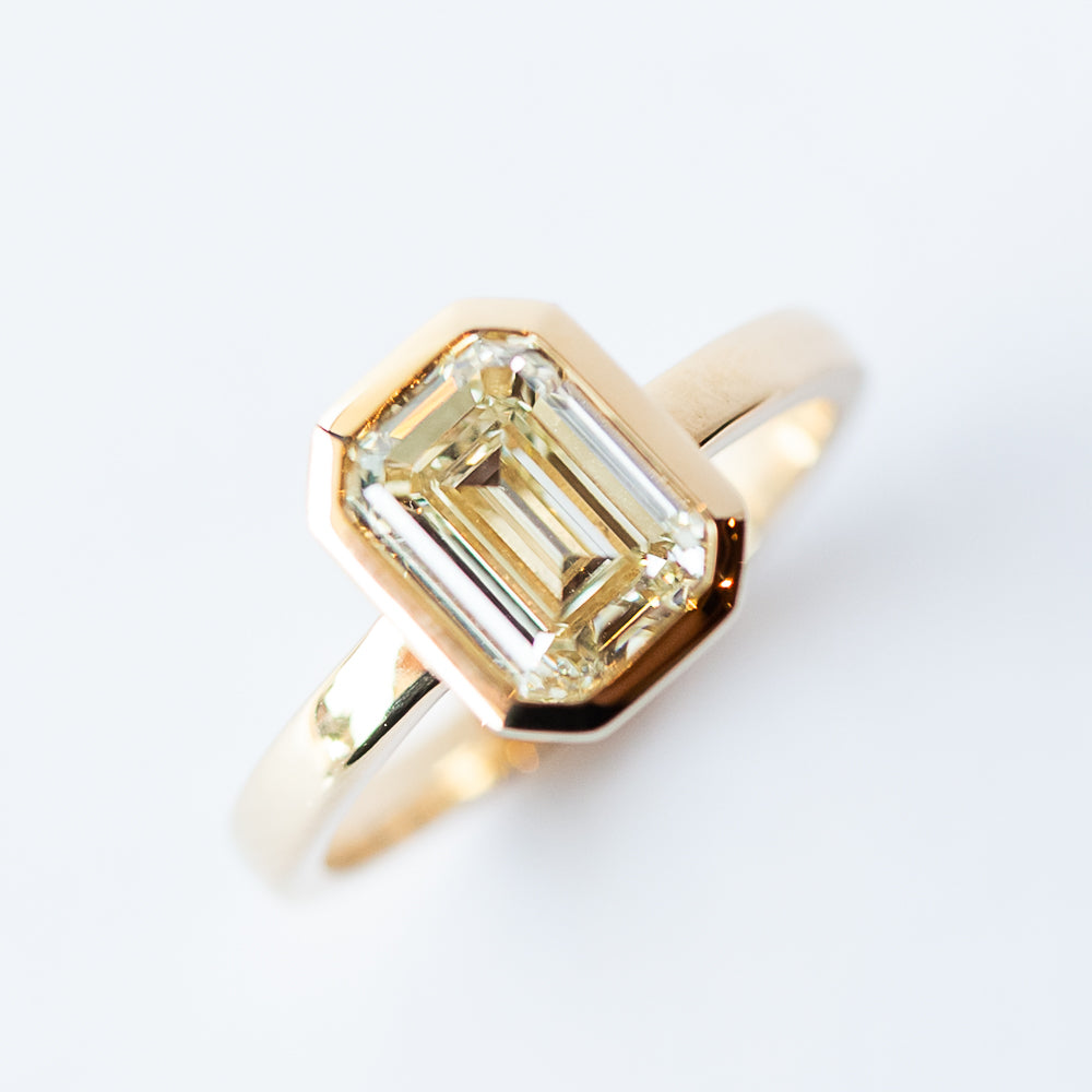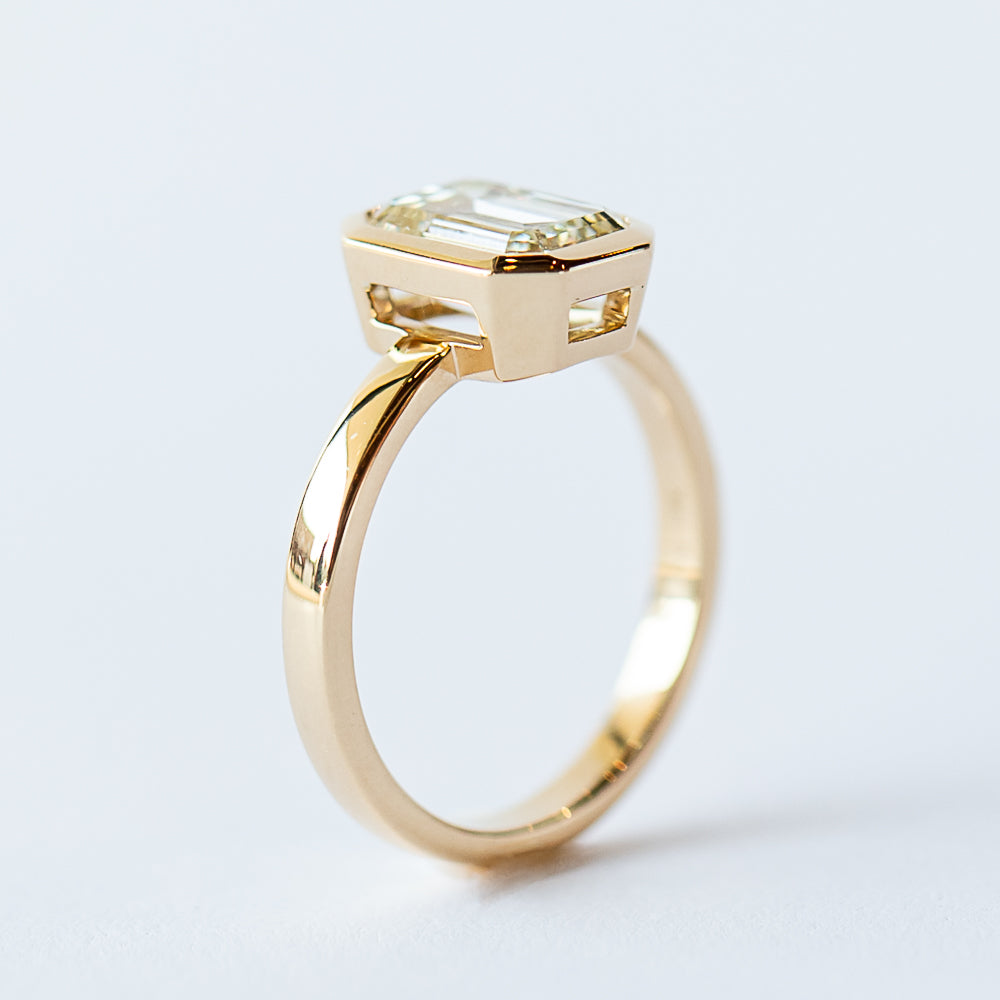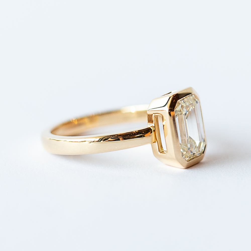 The Rae Ring by Single Stone is understated luxury at its finest. A 2.03ct emerald cut diamond is bezel set in rich 18k yellow gold, giving the stone a clean, modern frame while keeping a low-profile design that’s effortlessly wearable. The slim band adds to the refined silhouette, letting the diamond’s step-cut facets shine with subtle depth and elegance. With its warm N color and VS1 clarity, this GIA-certified diamond feels both classic and contemporary—perfect for someone who loves timeless style with a modern edge. Pair it with a wedding band to create your perfect stack.