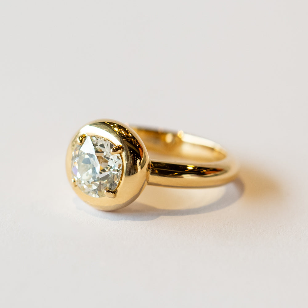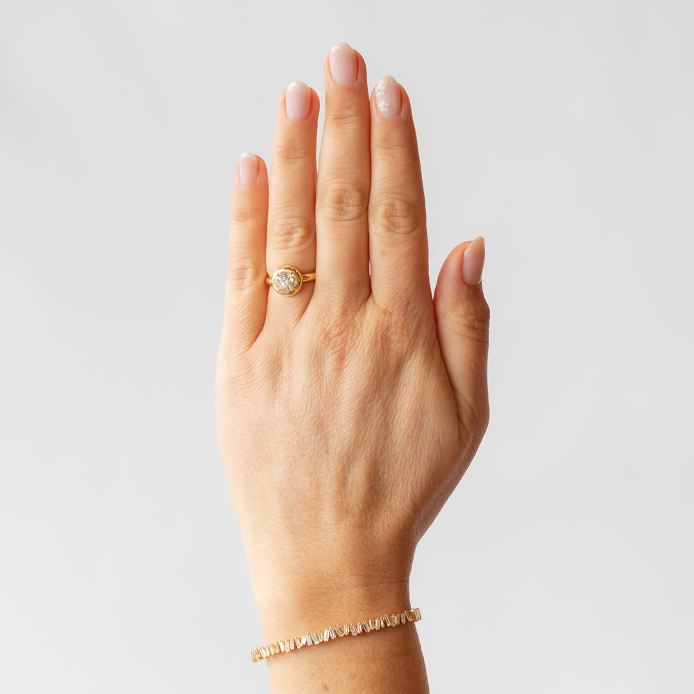 A modern stunner, the Randi ring from Single Stone is a clean, low-profile engagement ring that's as smooth as it gets. A gorgeous old European cut center diamond is set into dainty prongs in an exaggerated, bold gold halo that rests on a rounded, polished band. It's a solitaire ring that truly goes the distance, whether worn alone or paired with your favorite Single Stone band.