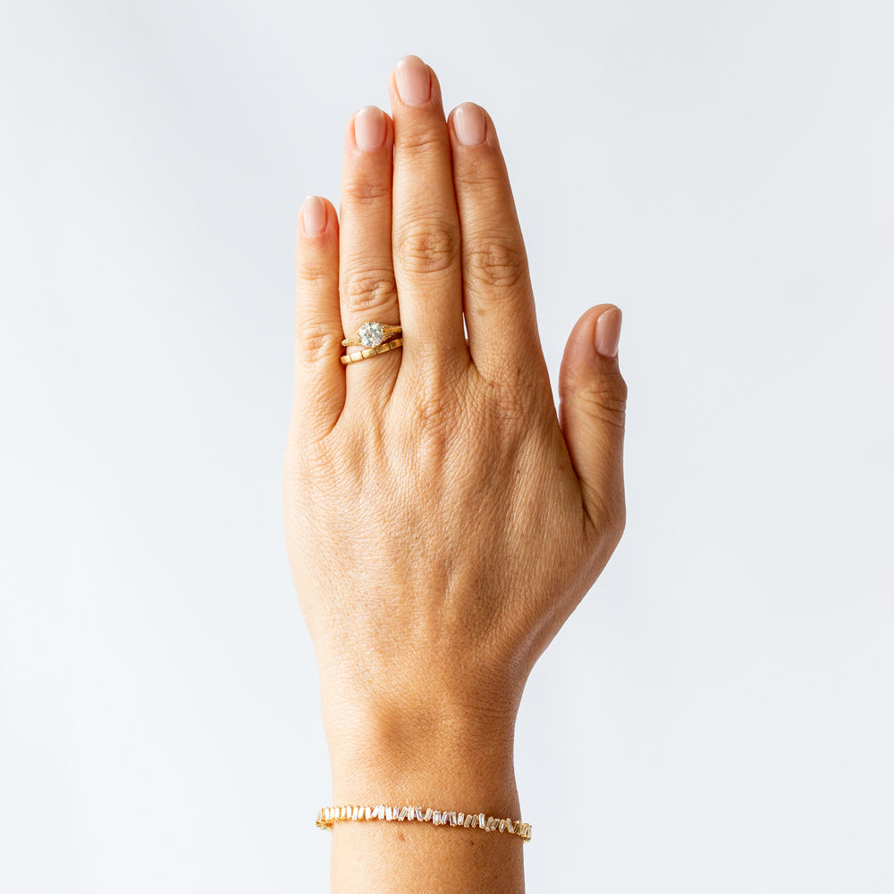 A little mid-century and majorly modern, Single Stone's Riley band is a sophisticated dream of a ring. Handcrafted in warm 18 karat yellow gold with a soft, brushed finish and ridged details throughout, this gold band is perfect on its own, playful in a ring stack, or as added texture and style matched with your engagement ring.