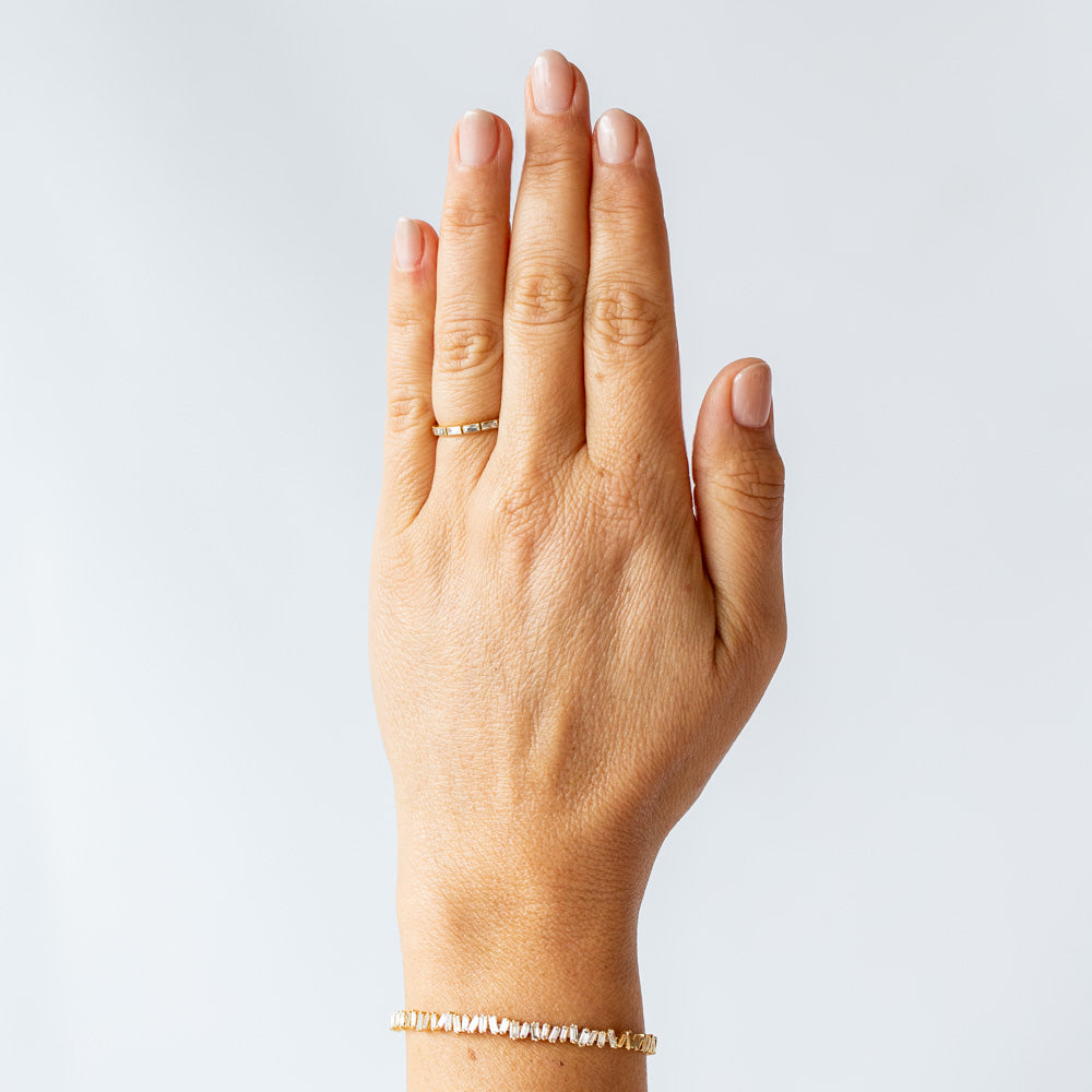 For an eternity band as unique as your love story, with a hint of vintage flair, the Julia band is our pick. Handcrafted in warm 18 karat yellow gold, this eternity ring features classic rectangular French cut diamonds that sparkle from every angle. They are individually bezel set with delicate milgrain edges to make up a seamless line of diamonds around your finger. Wear the Julia band as your wedding ring, paired with an engagement ring, on its own, or in your favorite ring stack.