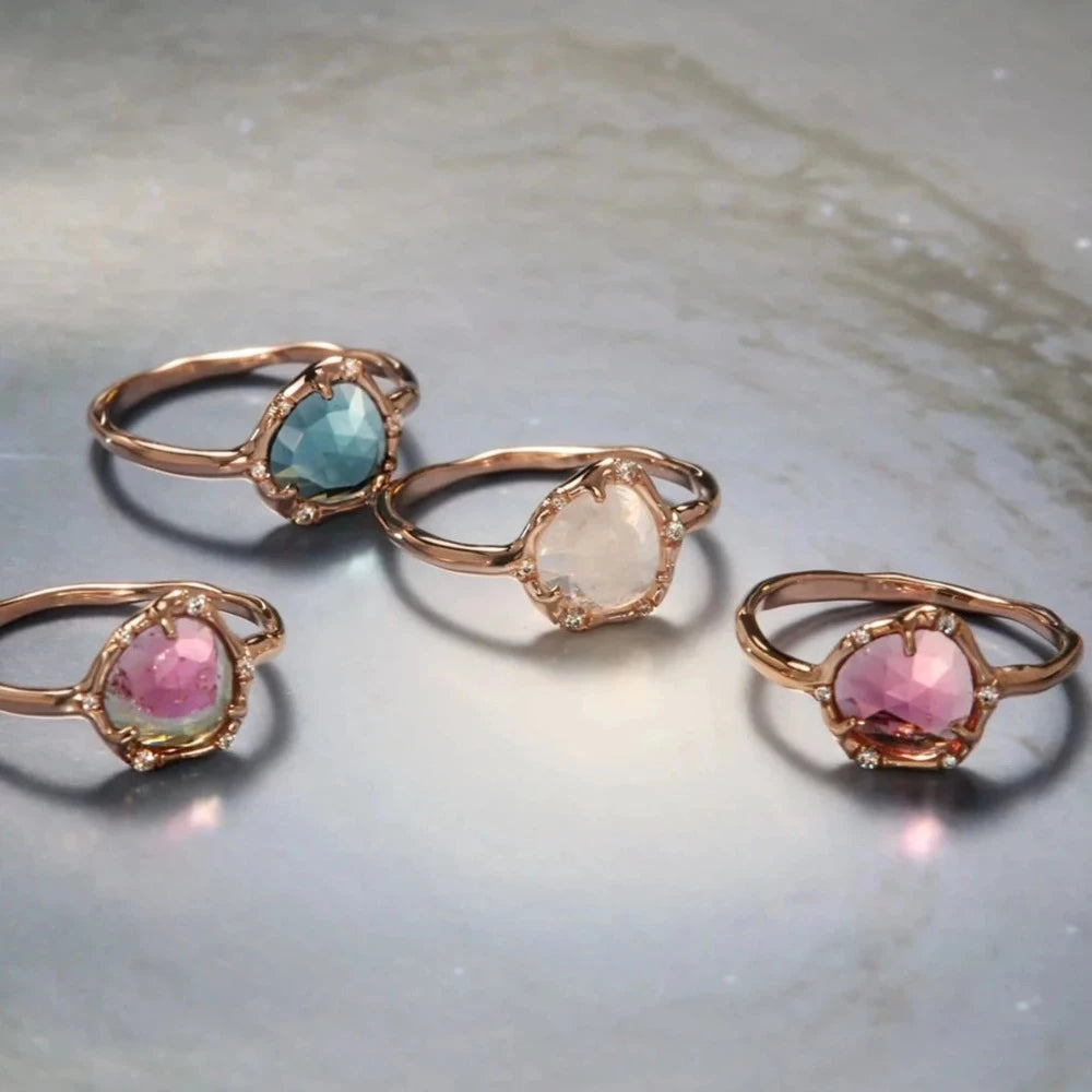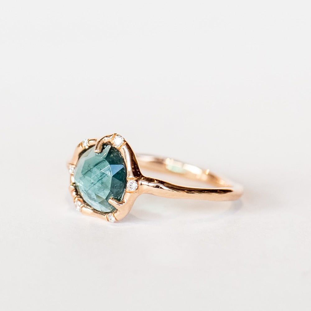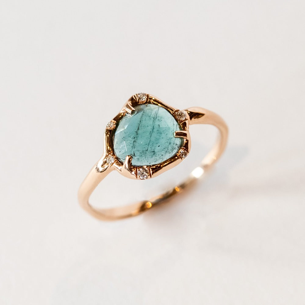 A cosmically inspired tourmaline ring with organic touches and diamond accents.