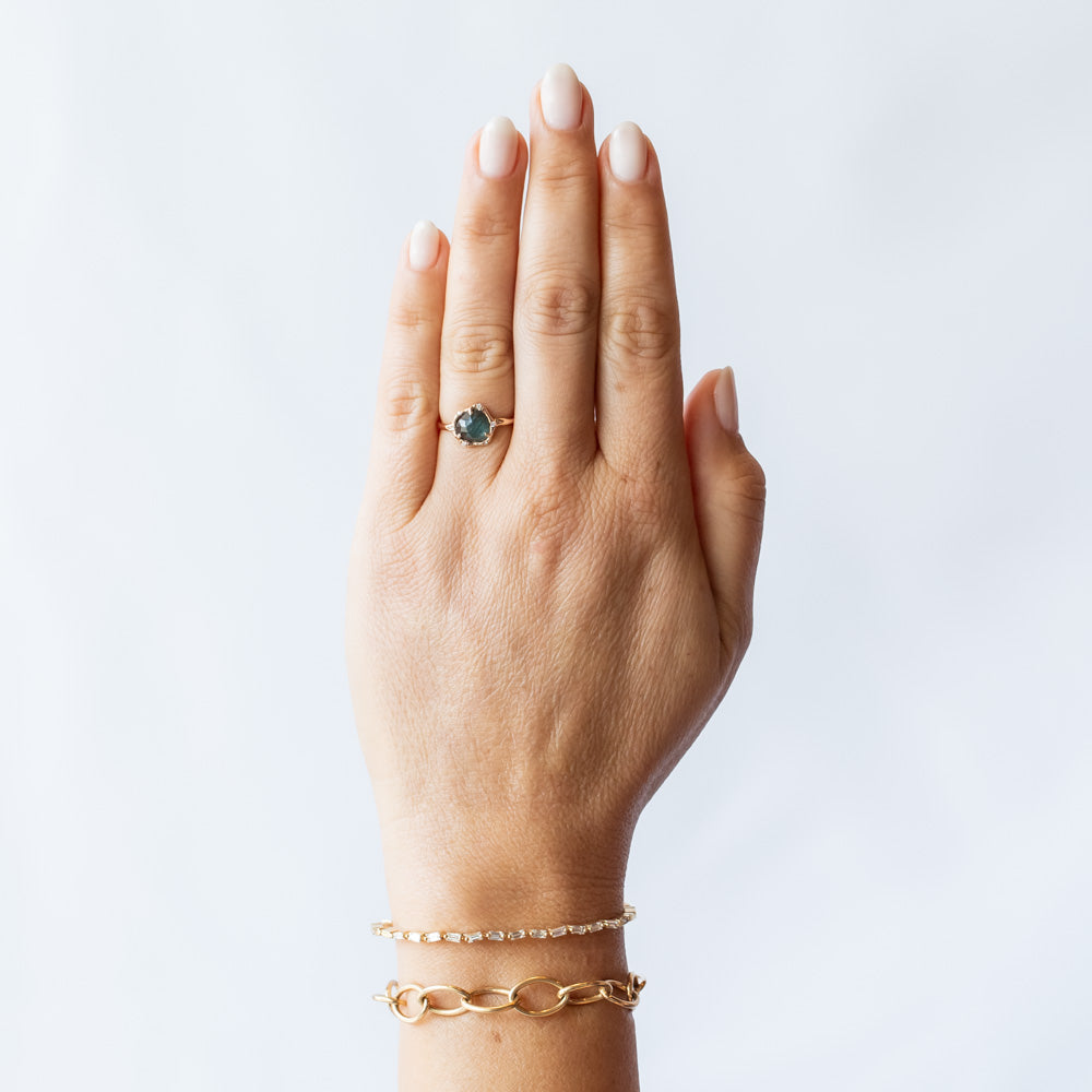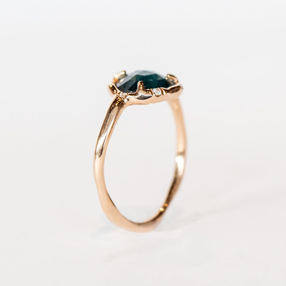 Blue indicolite tourmaline set in hand carved 14k rose gold