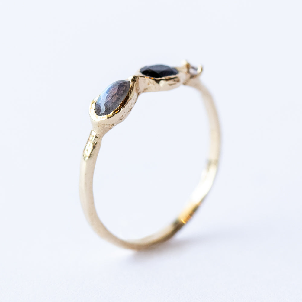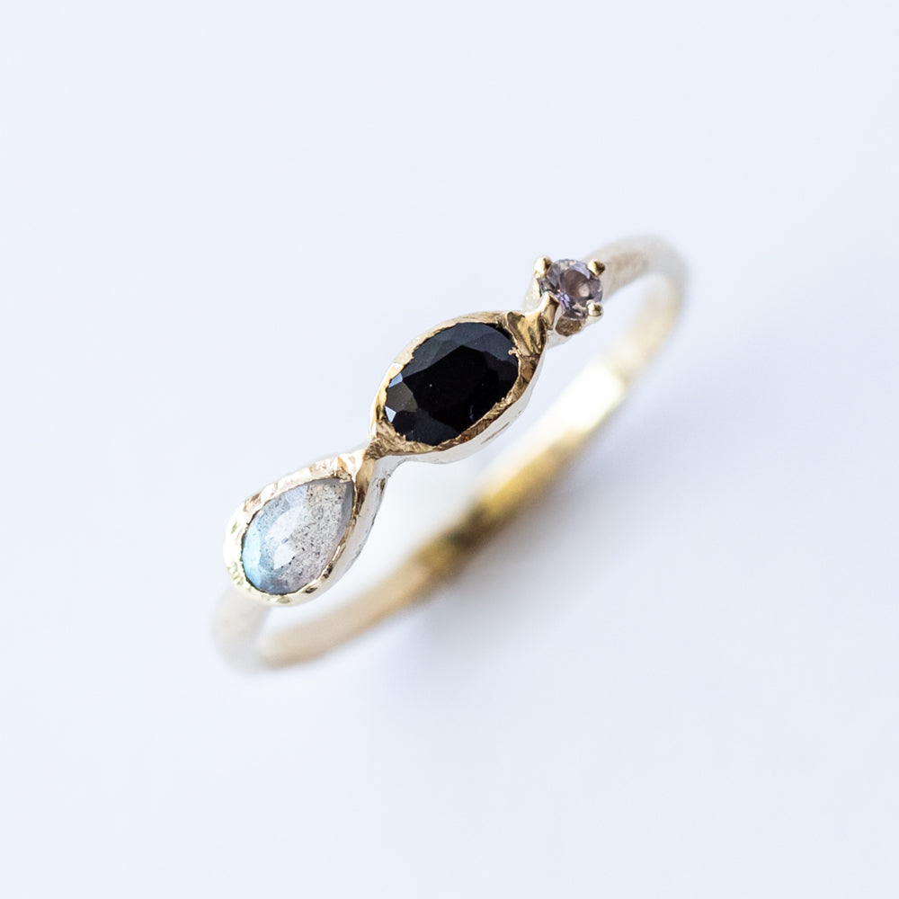 Featuring mystical labradorite’s signature flashes, a rich navy sapphire, and dreamy tanzanite, this ring is a total mood. Each stone is known for its magic—labradorite sparks intuition and transformation, sapphire is the September birthstone symbolizing wisdom and calm, while tanzanite brings soothing energy and creative clarity.