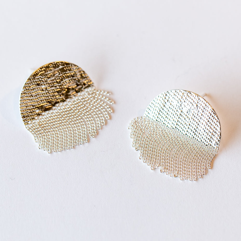 An oversized round stud earring for adding a statement pop to your look. The fringe moves when you do.
