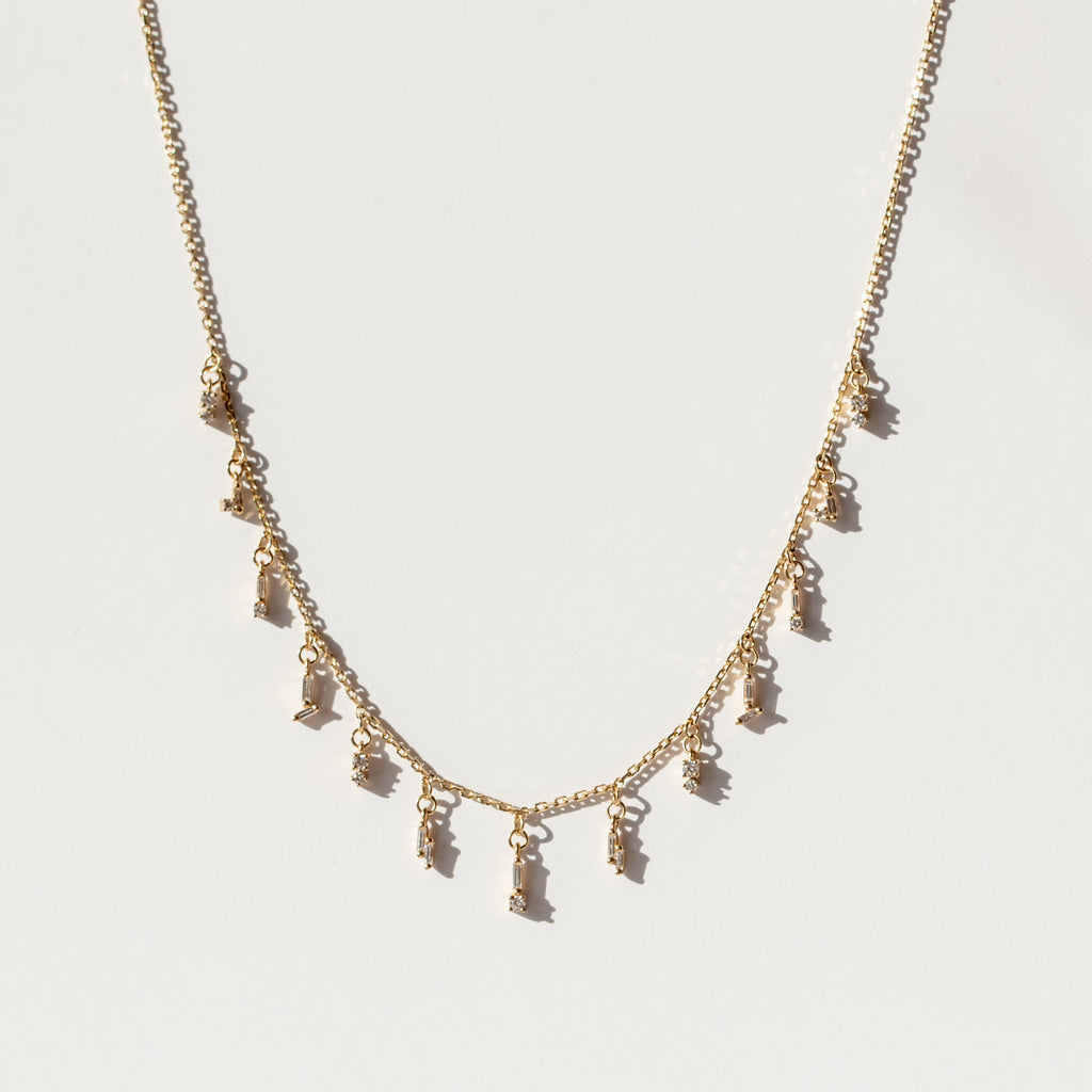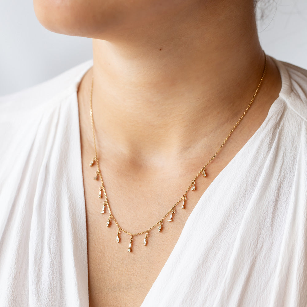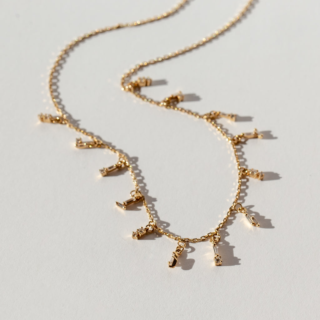 If you're on the hunt for a unique diamond necklace that you can dress up or down, this number from designer Suzanne Kalan is a shop favorite. This classic cable chain is adorned with Kalan's signature baguette and round brilliant cut diamonds set in delicate drops along the front. These brilliant, free-hanging drops create intense sparkle that flashes with every move you make. It's a beautiful necklace that works well on its own or layered with other necklaces from your jewelry collection. Wear it as bridal jewelry, give it as the perfect holiday gift, or treat yourself for a special occasion.