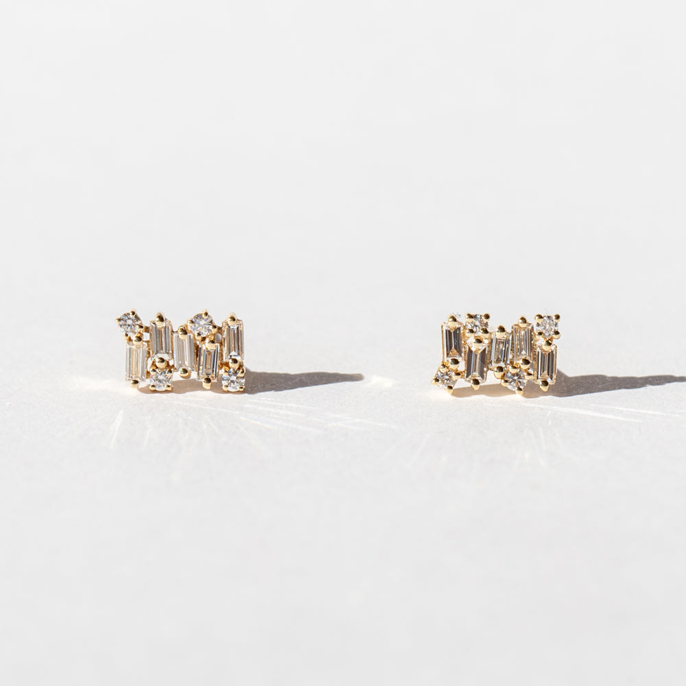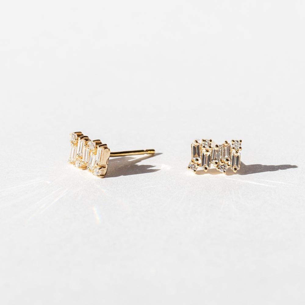 A classic Suzanne Kalan design, the shimmer bar features petite baguette cut diamonds accented by tiny round diamonds for an staggered, alternating pattern that gives you tons of sparkle. A unique take on classic diamond stud earrings, they look stunning alone or you can take everything up a notch by pairing them with other hoops and studs to create a layered look.