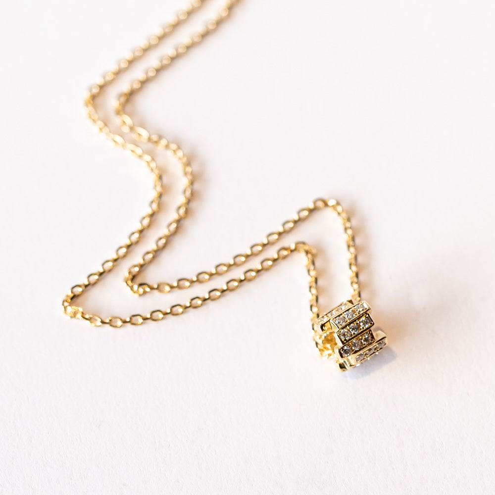 We love this petite diamond pendant from Suzanne Kalan for the perfect balance between luxury and wearability. Her staggered signature design is present in the edges of this dainty rondelle bead which slides along a classic gold cable chain. The rondelle is set all the way around with a total of .20 carats of pavé white diamonds. The adjustable 16"-18" chain allows for customizable styling, making it ideal for layering with other necklaces or wearing alone for a minimalist everyday look.