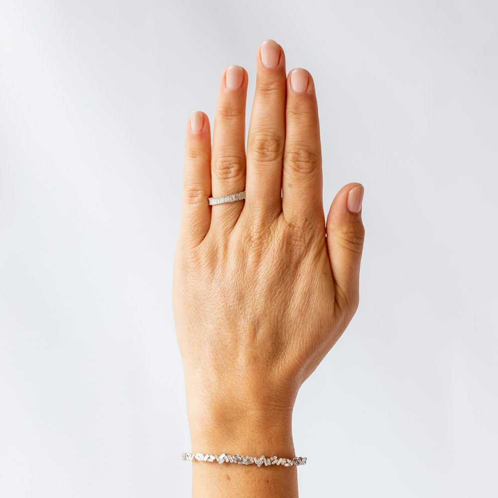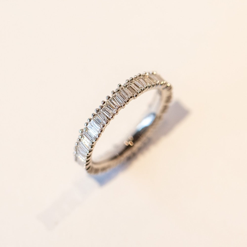 Perfect as an anniversary band, wedding band, or just because, this mini eternity band offers a modern twist on a classic look. The baguette diamonds catch the light at every angle, adding a touch of luxury and sophistication to any jewelry collection.
