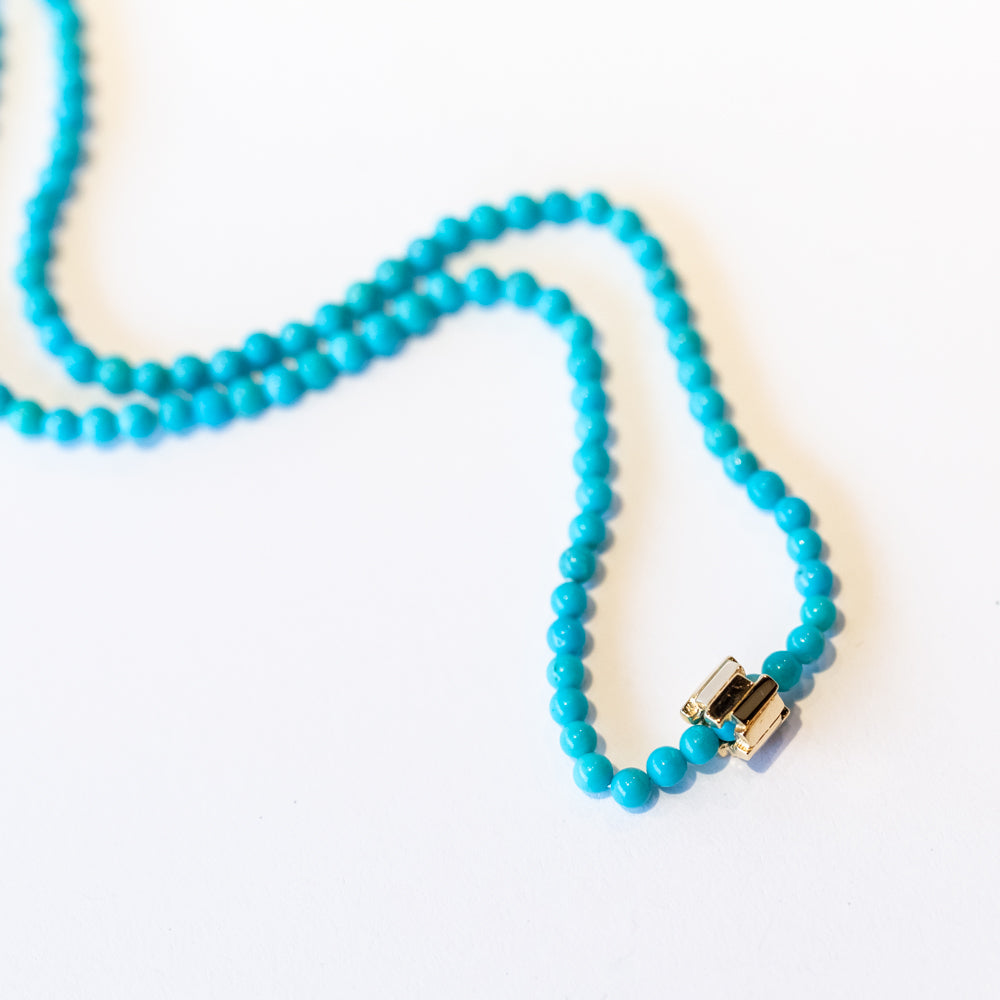 Vibrant turquoise meets luxe 18k yellow gold in this effortlessly cool beaded necklace. A dainty strand of bright turquoise beads is punctuated by a single golden rondelle that glides along the strand, adding a playful yet refined touch. Designed to sit at choker length (15–16.5 inches adjustable), this piece is made for layering—but trust us, it’s just as striking on its own.