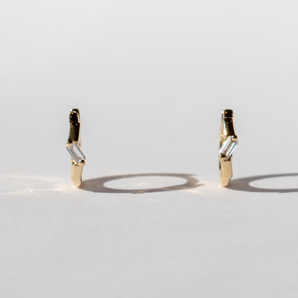Love a minimal look with just a hint of glimmer? These modern gold huggie earrings are one of our favorites. Each gold hoop earring is set with a slightly angled baguette diamond to give you a bit of sparkle and the petite size makes them perfect for everyday wear.