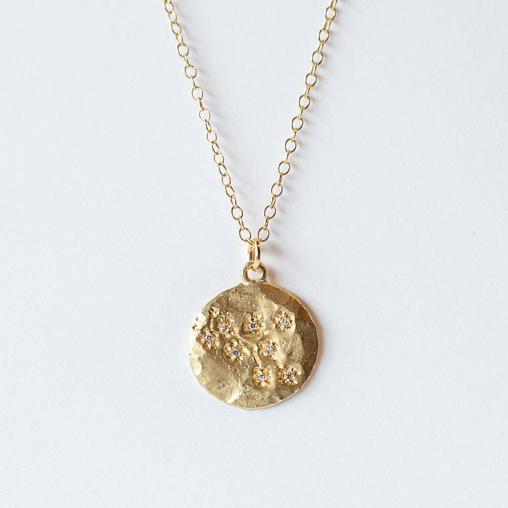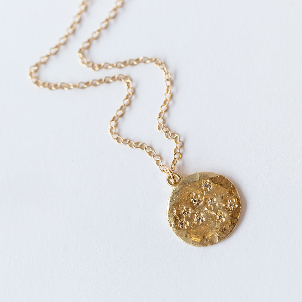 A symbol of beauty, renewal, and the fleeting nature of life, delicate cherry blossoms are stamped into this meaningful gold pendant. Handcrafted in hammered yellow gold with a soft matte finish, each blossom is dotted with a tiny diamond center for just a hint of sparkle.