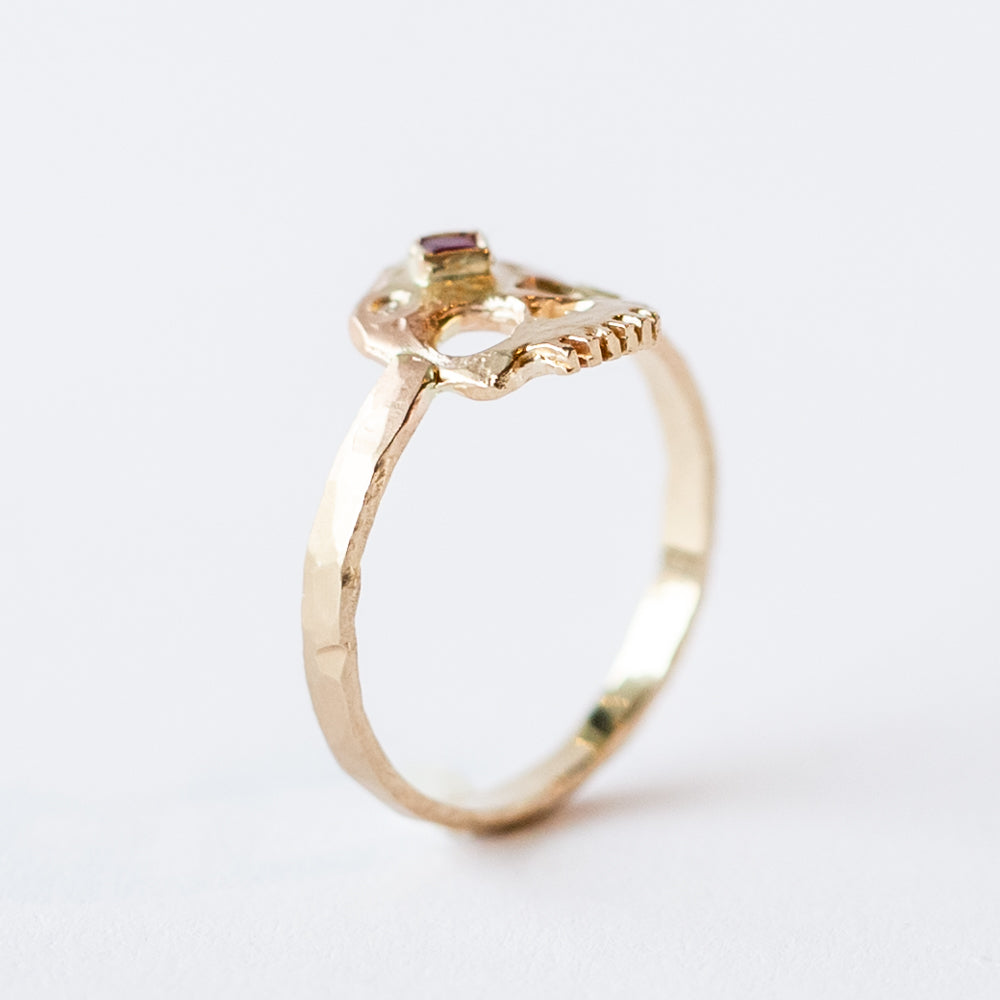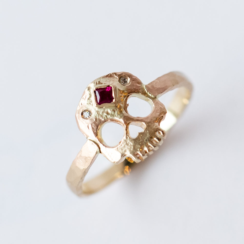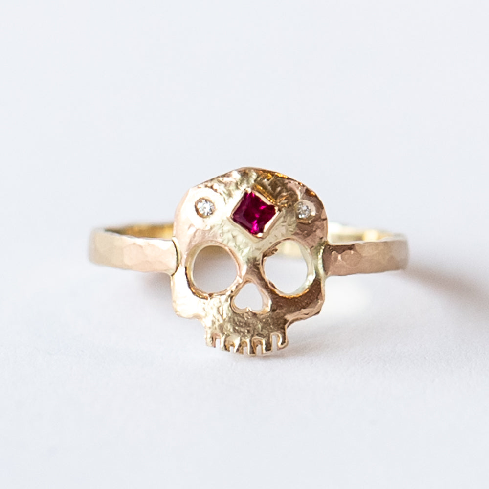 Edgy yet always elegant, we love Victoria Cunningham's cut-out skull ring for adding a touch of character to your jewelry collection. Handcrafted in hammered, matte-finish yellow gold, the skull is set with a ruby "third eye" and two tiny diamonds, making it even more meaninful.