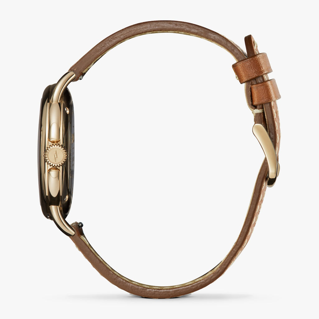 Built to last and named accordingly, this 41mm Runwell is outfitted with a timeless gold case and brown strap that will look as classic in a decade as it does this very minute. Black Arabic numerals and indices stand boldly against the milky white enamel dial, while a sub dial punctuates the look and completes the impressive presence of the polished gold PVD case. From the laser-etched case back to the etched lightning bolt on the buckle, every detail of our flagship timepiece has been engineered with an obsessive focus to ensure it can be worn any way—for years to come.