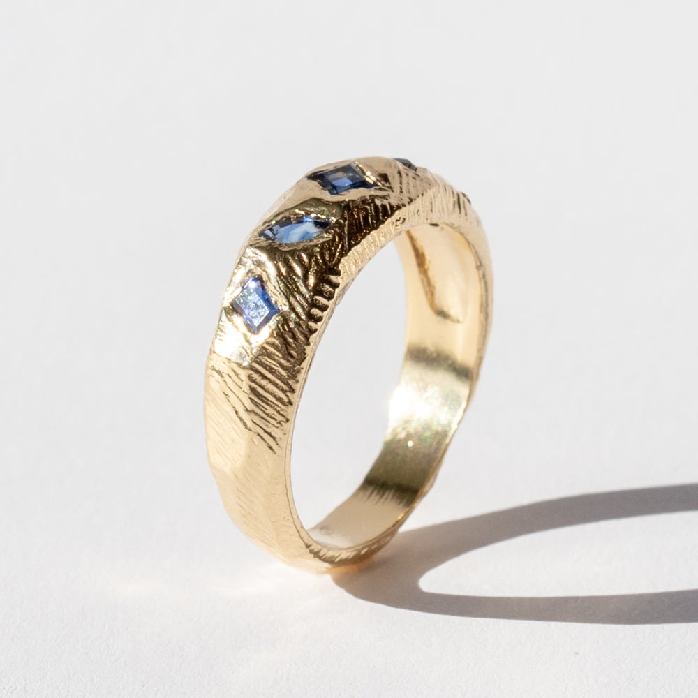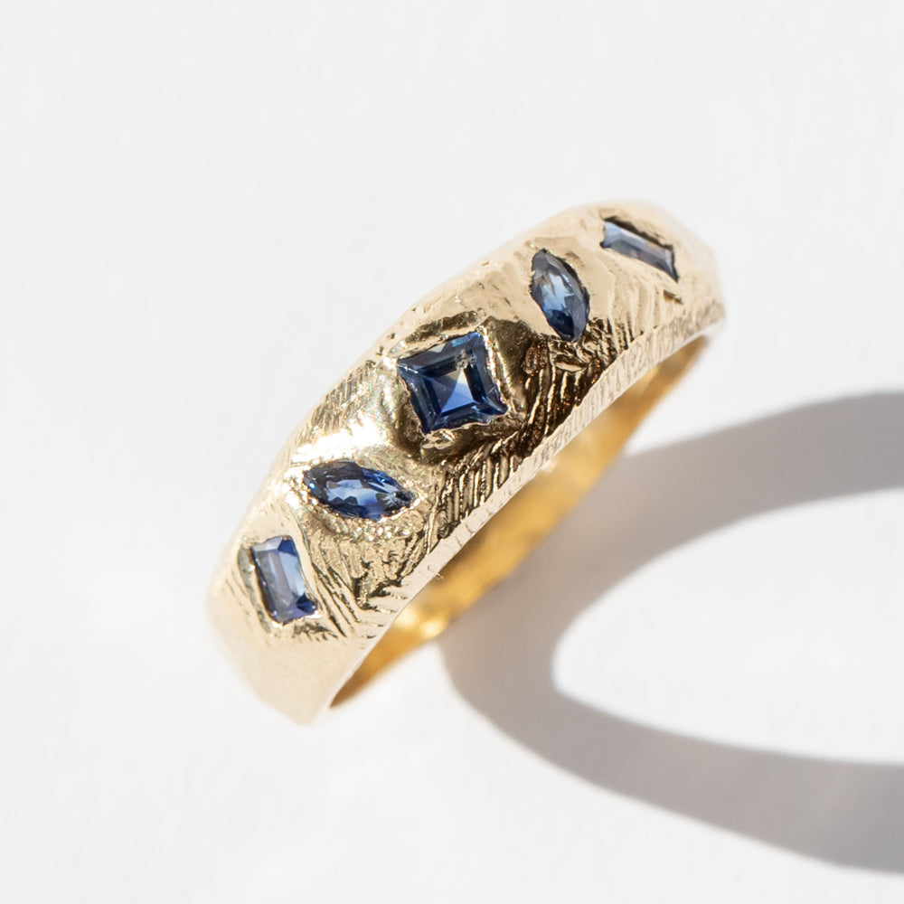 We love this funky, modern gemstone ring from designer Page Sargisson. Handcrafted in 18 karat yellow gold, the wide, domed style features Page's signature hand-carved texture, flush-set with five shimmering blue sapphires. The mixed shapes and angles of the gemstones give this chunky gold ring plenty of personality, making it a serious statement whether you wear it solo or stacked with other rings for a layered look. Sapphire is also September's birthstone, so it's a bold pick as a gift for someone special (including yourself)!