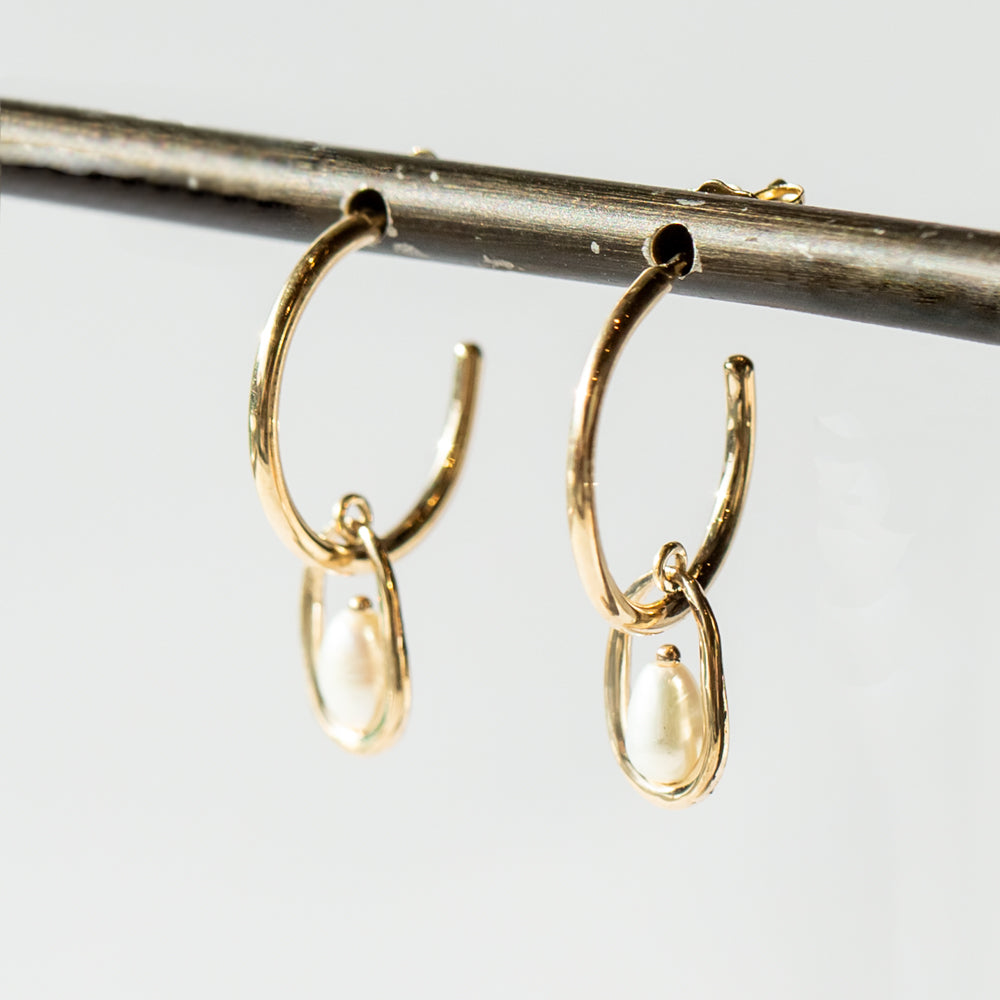 A freshwater pearl, silhouetted in gold, hangs from a gold hoop. An unexpected take on a classic design.