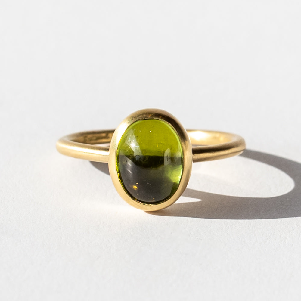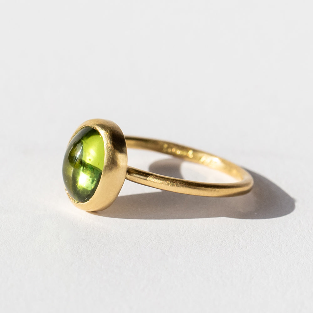 Give your daily look a refreshing edge with this bright green peridot gemstone ring from Satomi Kawakita. A solitaire cabochon oval peridot is bezel set into brushed 18 karat yellow gold for a look that's simple yet totally sophisticated. Peridot, August's birthstone, is prized for its uplifting energy, considered a stone that clears the mind and brings good fortune. Whether you're in it for the meaning or just the lively beauty of this natural gemstone ring, we love it for a pop of color solo or in your ring stack.