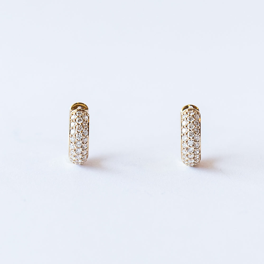 A modern twist on the classic huggie—these rounded gold hoops are lined with three vertical rows of pave-set diamonds that catch the light with every move. Their domed shape gives them a bold, sculptural feel while still staying comfortably close to the ear. Diamonds, April’s birthstone, are tied to strength, love, and clarity, making these earrings as meaningful as they are wearable. Perfect for everyday sparkle or dressing up your go-to gold stack.