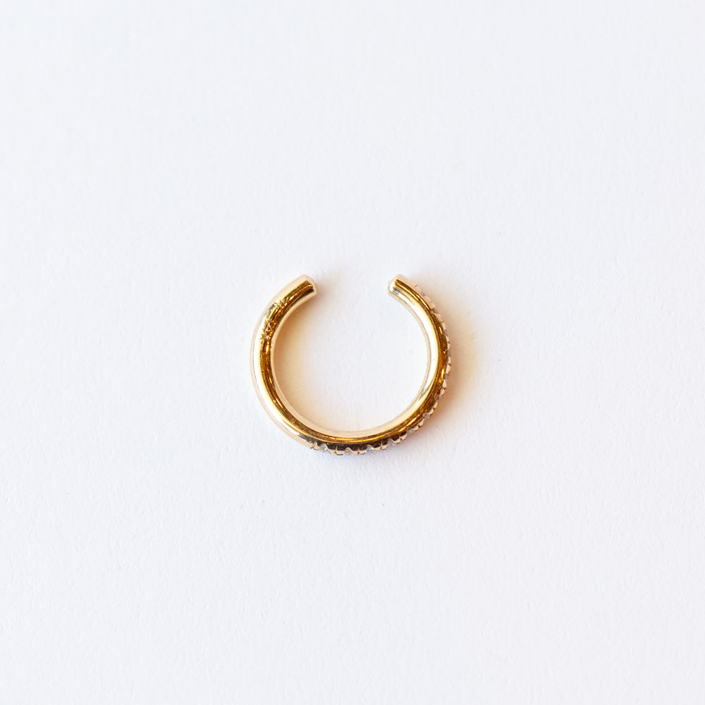 This thick wire style 14k gold ear cuff brings you subtle drama. Twelve French-set pavé diamonds curve along the outside for a dose of sparkle. No piercing needed, just slip it on and shine.