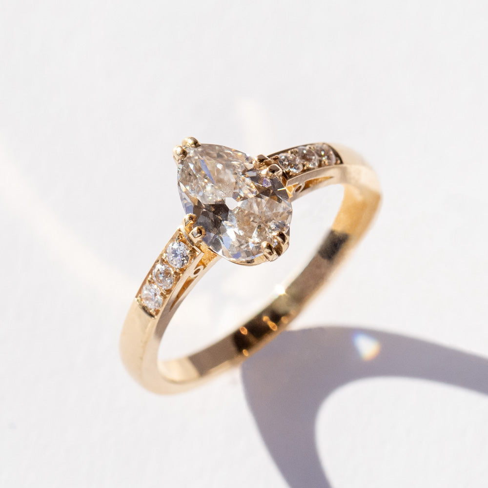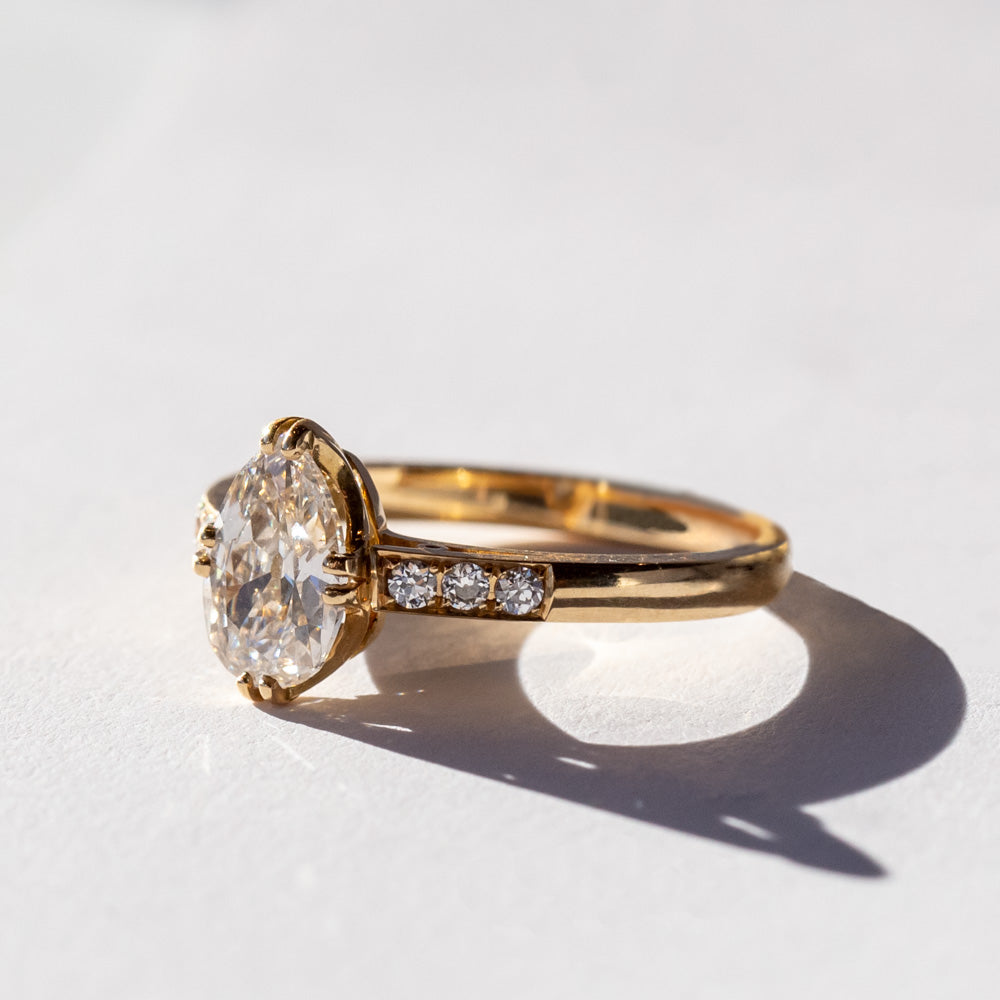 When we first saw this engagement ring, we were literally picking our jaws up off the floor, y'all. The Bauer Ring is a stunning, modern take on the classic diamond solitaire (with a bit of extra flair, of course). At its center, a sparkling pear diamond takes the spotlight, prong-set in 18k yellow gold for maximum brilliance. Flanked by rows of old European cut diamonds, this ring has just the right amount of vintage sparkle to complement the sleek, contemporary shape of the pear cut.