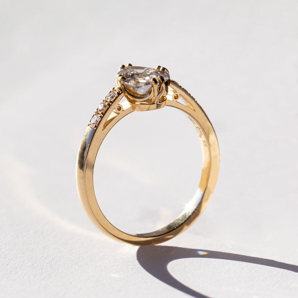 For those who love pear diamonds, this engagement ring is a showstopper. It’s the perfect choice for anyone seeking a diamond solitaire with a bit of extra personality. The pear cut diamond will have you swooning, and the gold setting? Simply timeless. Pair it with a Single Stone wedding band for the ultimate ring stack.