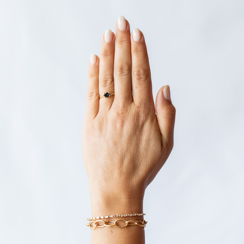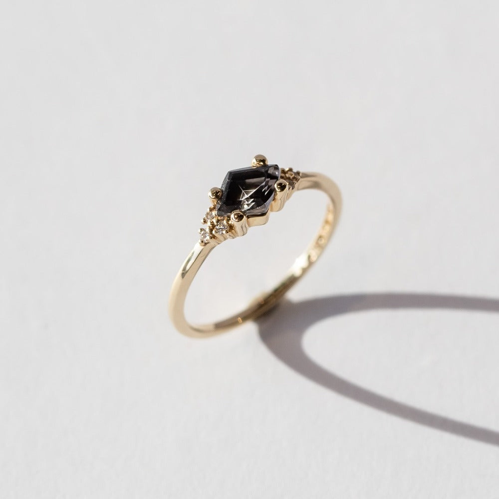 This dainty ring from designer Suzanne Kalan gives any look a little edgy color. It features a kite-shaped Black Night Quartz at its center, flanked by six petite round white diamonds all set in brightly polished 14 karat yellow gold.