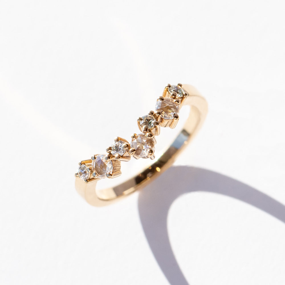 The Brooke Contour Band is here to change the game when it comes to stacking rings. With .33tcw of old European cut diamonds and rose cut diamonds prong set in 18k yellow gold, this diamond contour wedding band is both elegant and bold. The pointed shape fits perfectly around your engagement ring, creating a seamless, one-of-a-kind look that’s so Instagram-worthy.