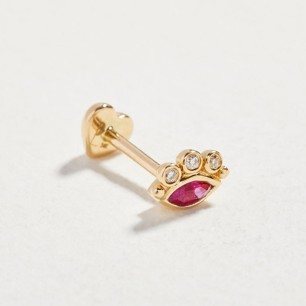 An unexpected, sophisticated eye stud with a deep red oval ruby accented with tiny diamonds to create a sunburst effect. Wear as a signature piece in a rook, helix, or conch piercing or in your lobes for some added luminescence.