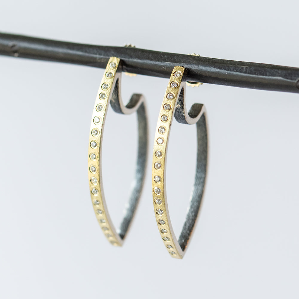 Add a bit of refined edge to your look with Rene Escobar’s Celine marquise-shaped hoops. Crafted in 18k yellow gold over oxidized sterling silver, these medium-sized hoops have an elongated, marquise-inspired silhouette. Lined with sparkling round white diamonds along the front, they add just the right amount of shimmer without being overpowering. Wear them to elevate your everyday style or accentuate evening outfits — these hoops are all about subtle drama and modern elegance.