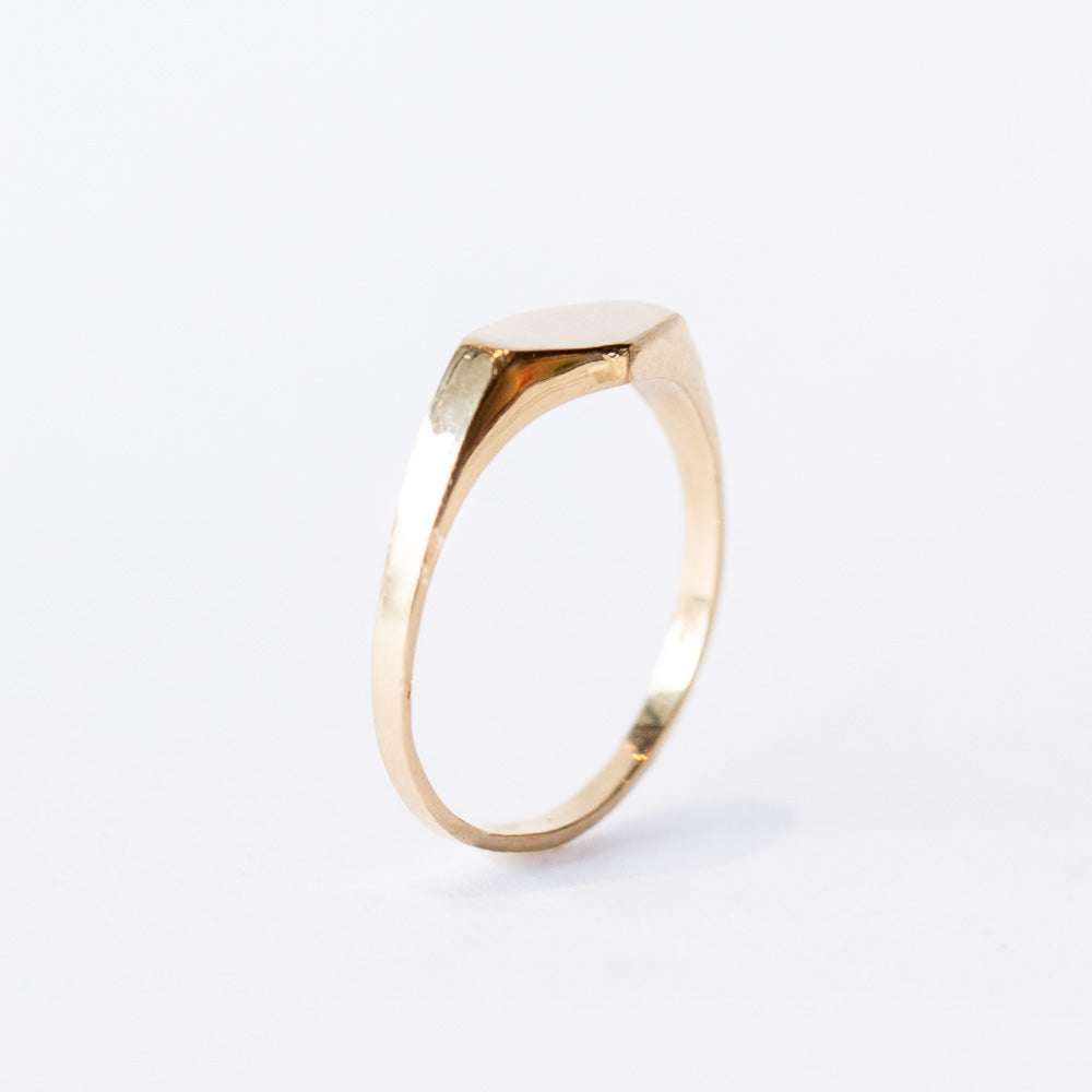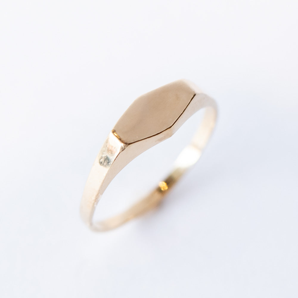 Hand carved in bright yellow gold, this Adeline signet ring is a modern take on the historical signet ring style. Its elongated hexagon face plays well with other rings so you can stack it high or let it stand out on its own.