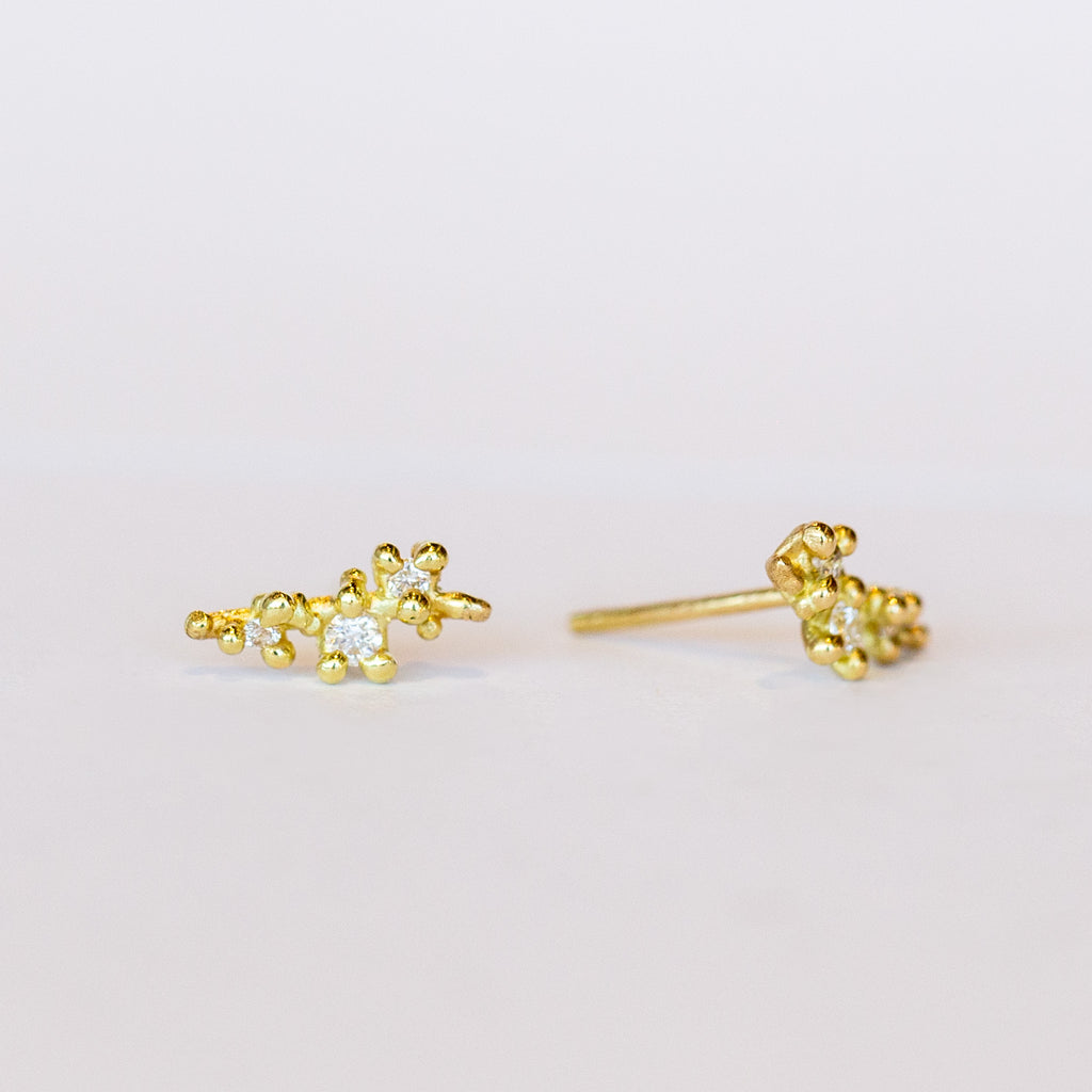 A sweet pair of yellow gold studs, each encrusted with three twinkling white diamonds amongst our signature golden granules.