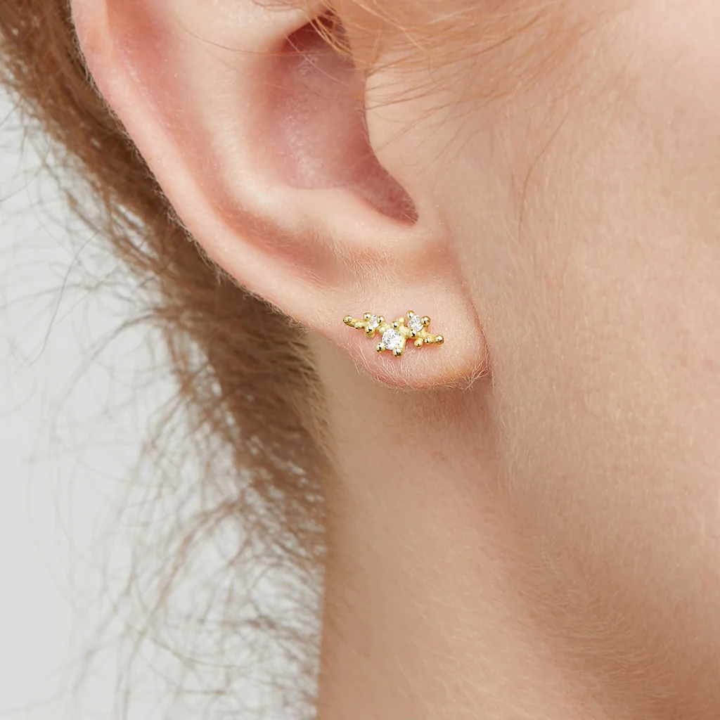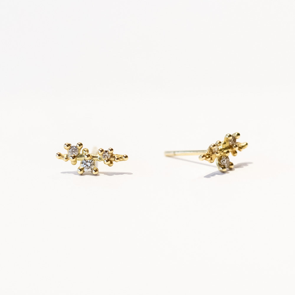 A sweet pair of yellow gold studs, each encrusted with three twinkling white diamonds amongst our signature golden granules.