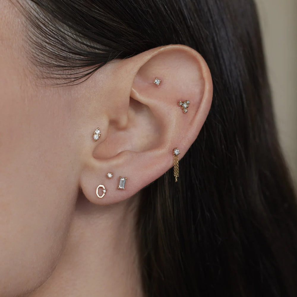 Sculptural, refined, and just the right amount of unexpected—this geometric gold stud is a tiny work of art. Inspired by nature’s effortless design, its open octagonal form is accented by a single reclaimed diamond, adding a whisper of sparkle to its fine lines. Whether worn alone or layered in a stack, it’s the kind of piece that quietly stands out, catching the light (and compliments) with every turn.