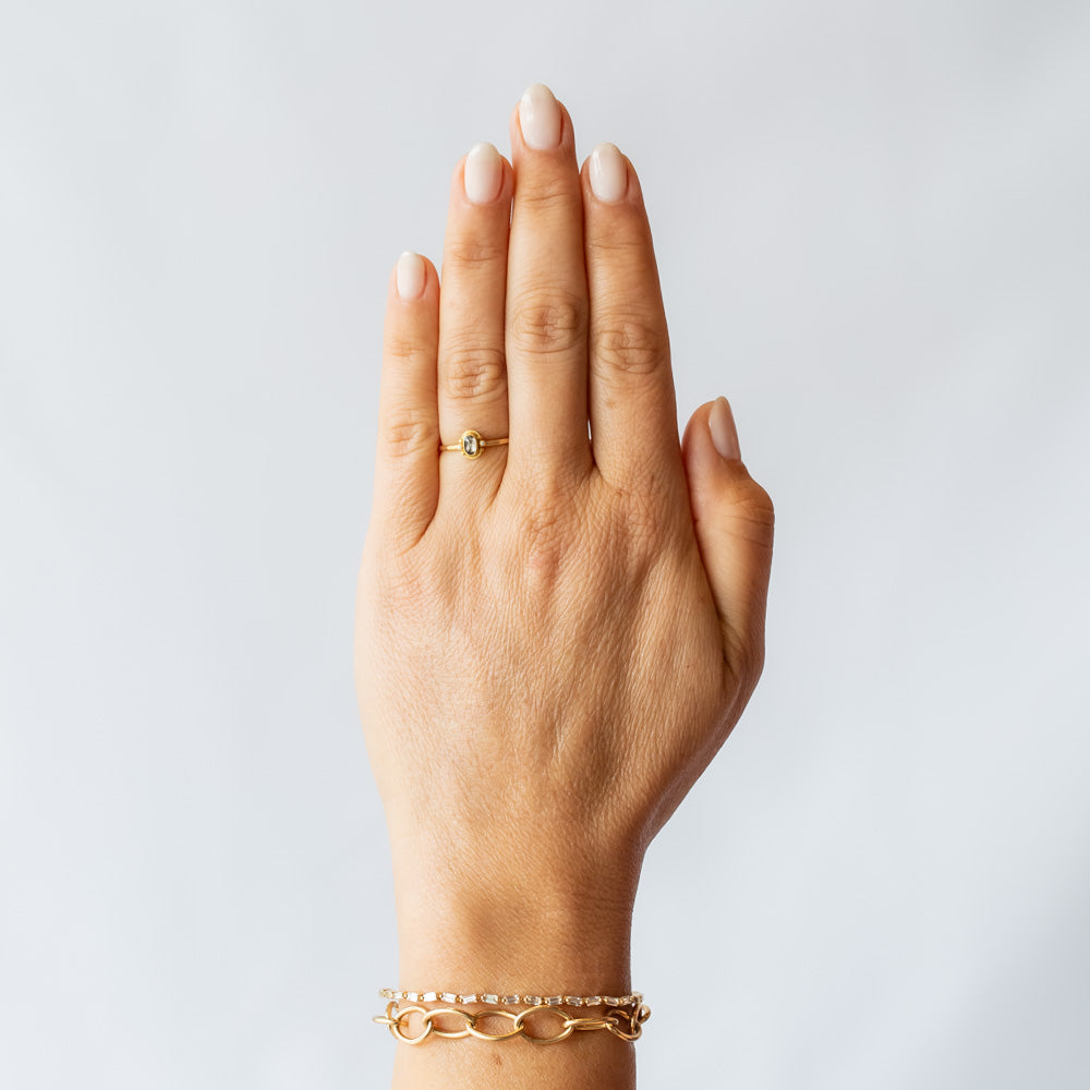 Designer Ananda Khalsa draws on the precious qualities of ancient jewelry, marrying them with a modern sensibility in this petite diamond ring. A rose cut, salt and pepper oval cut diamond is set in a 22k yellow gold bezel on an 18k yellow gold band. Two tiny round diamonds accent either side of the stone with gold dot motifs. Whether worn on its own, as a stacking ring, or as your engagement ring, this unique gem will shine in your collection.