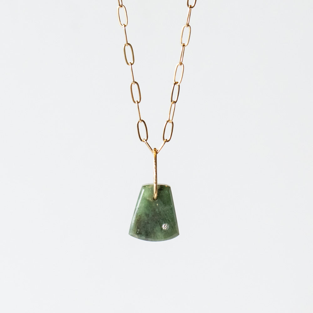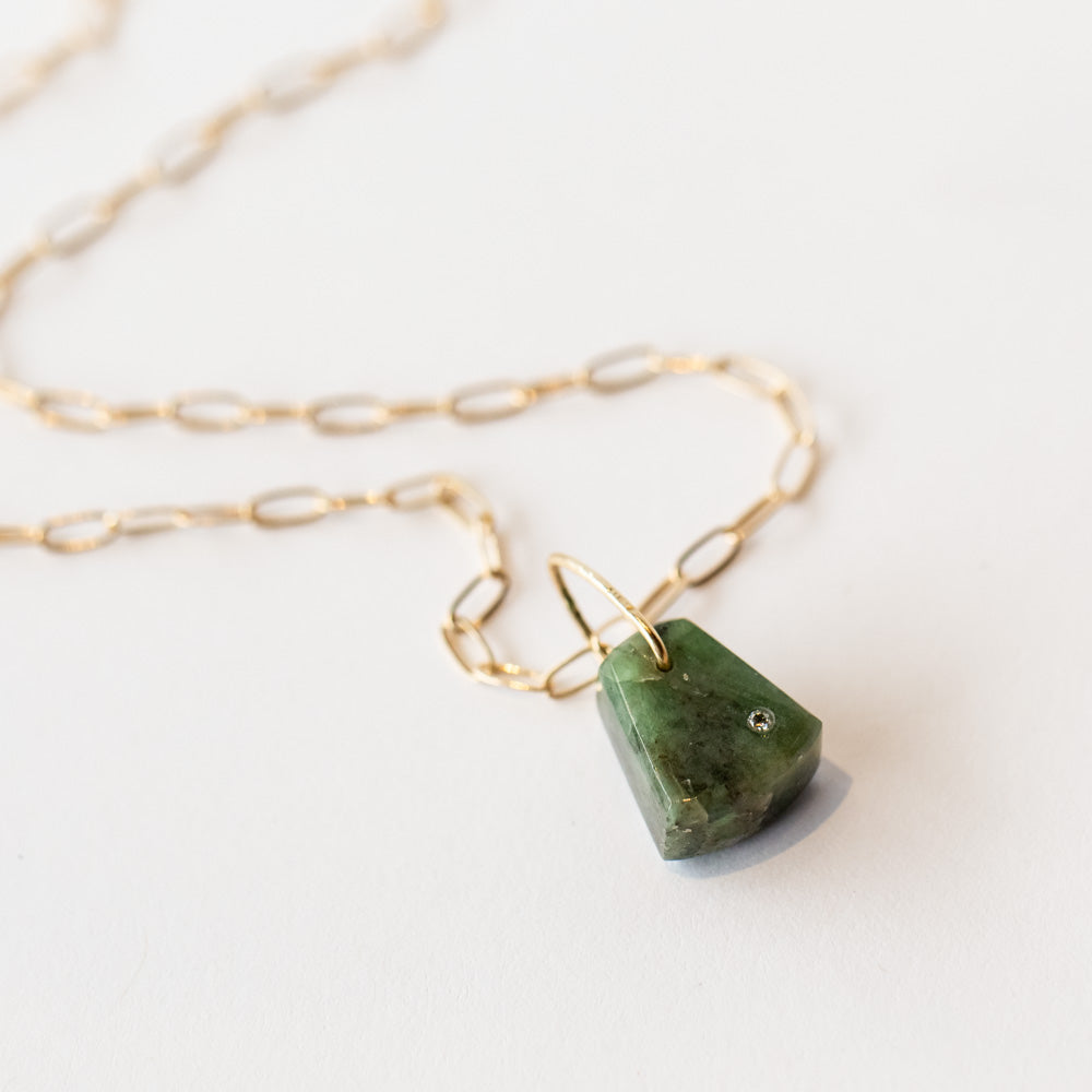 Smooth emerald charm cut by hand and set with a tiny white diamond