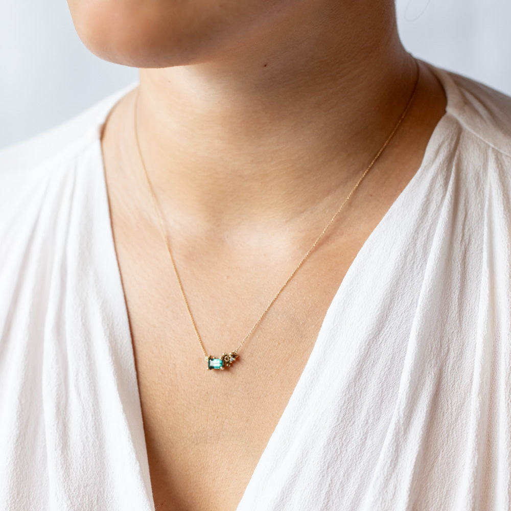 Add some sophisticated color to your everyday with this gemstone pendant necklace from designer Ruth Tomlinson. It features an emerald cut, deep green tourmaline set in a handcrafted cluster pendant of Ruth's signature golden granules with barnacle detail and small white diamond accent stone.