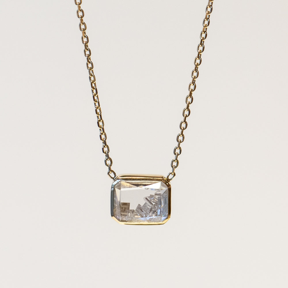 A bold take on timeless sparkle. The Esmeralda Diamond Shaker Necklace by Moritz Glik features an east-west rectangular white sapphire Kaleidoscope Shaker™, filled with brilliant white diamonds that shift and shimmer with every move. Set in 18k gold, this dynamic piece brings a modern edge to classic luxury, effortlessly blending elegance with playfulness.