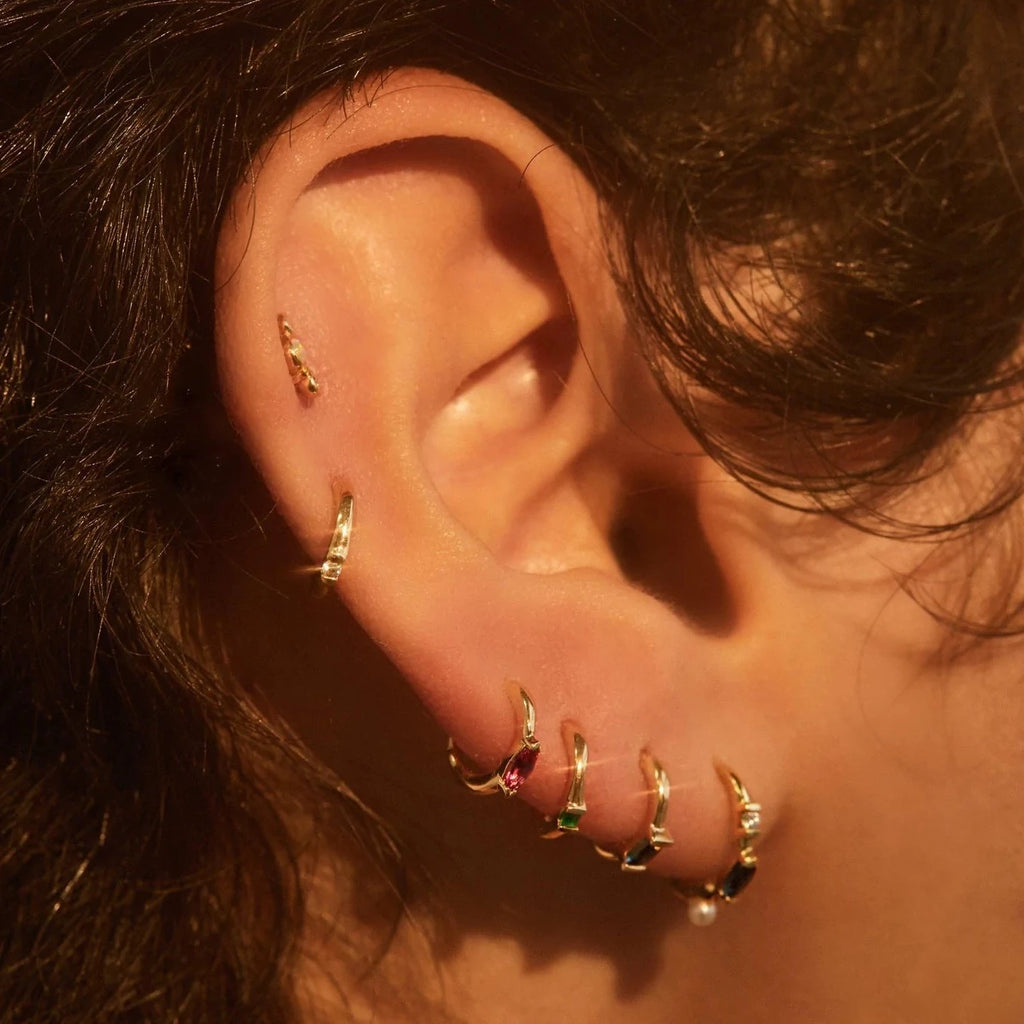 A delicate clicker hoop in an offbeat wavy finish with a floating white diamond. A great everyday option for the helix, lobe, and nose piercings.