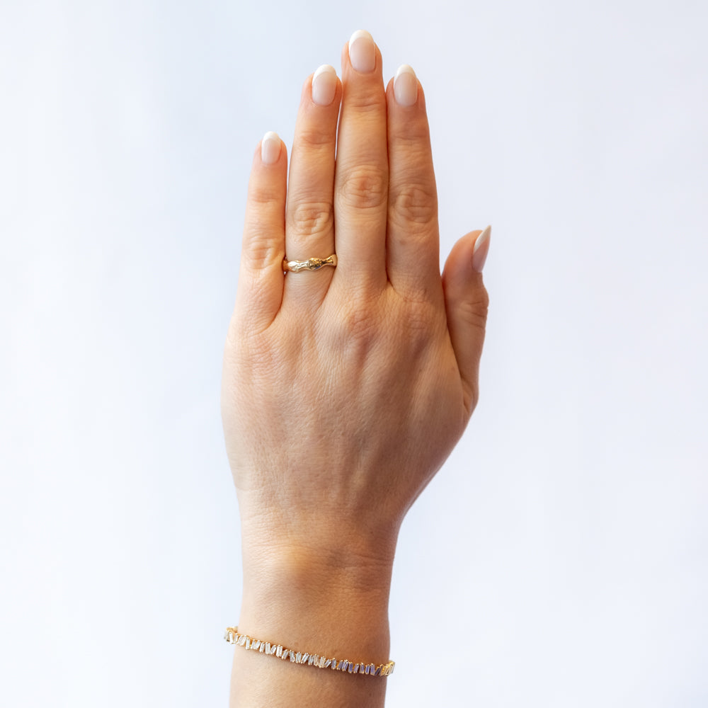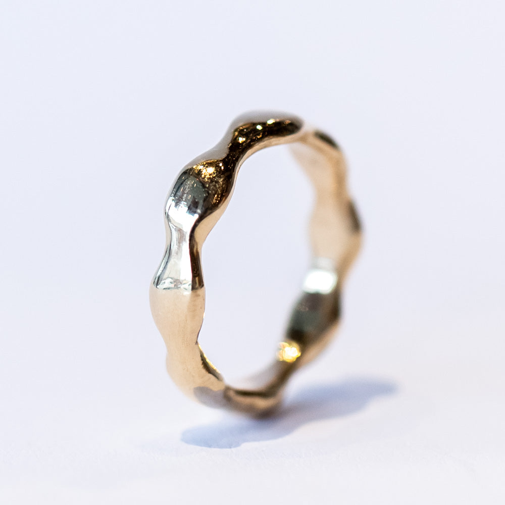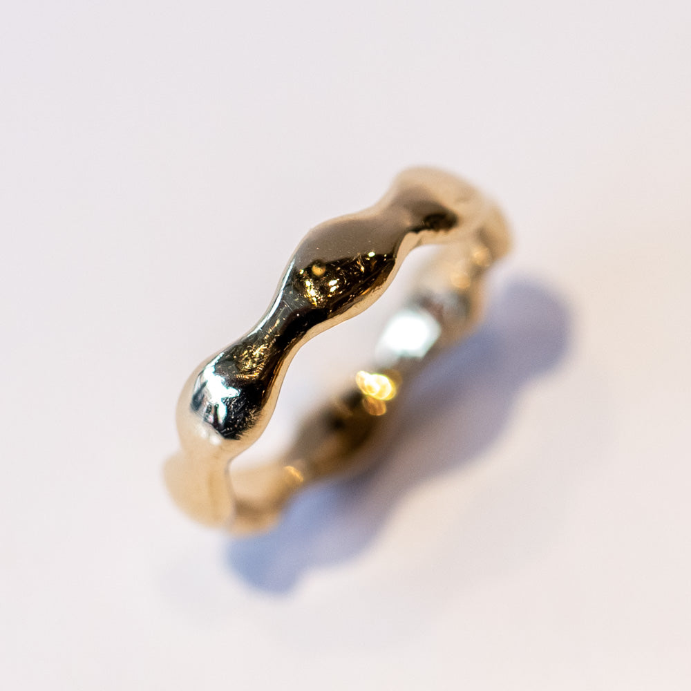 This wavy gold band is pure, effortless cool. Handcrafted with soft, flowing curves, it gives you a balance of modern minimalism and fun flair. It works solo or as a stacking ring. The smooth, continuous wave design is perfect for someone who’s all about going with the flow. Whether you're wearing it every day or saving it for special moments, this band is one that’ll never feel too heavy-handed, just beautifully understated and always in style.