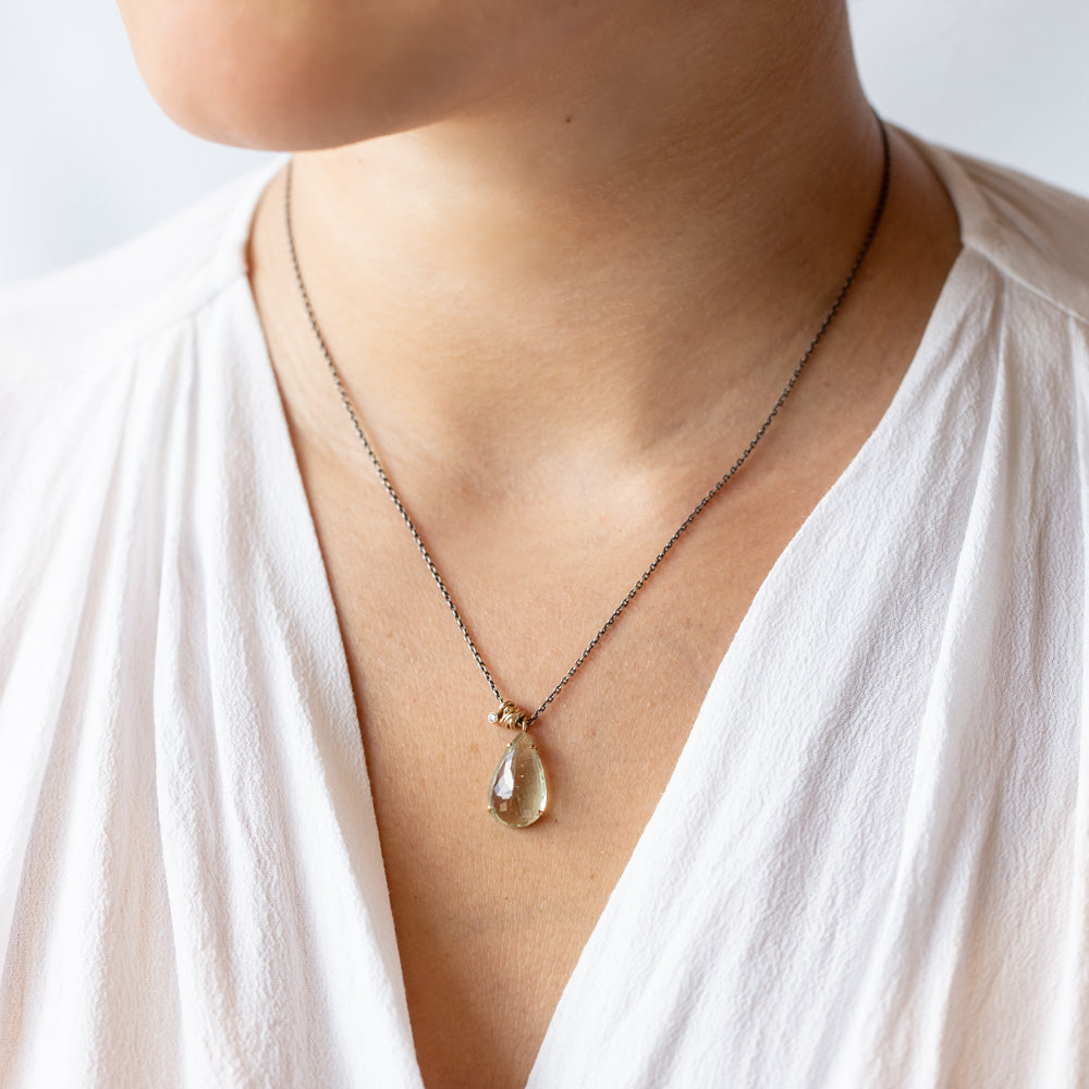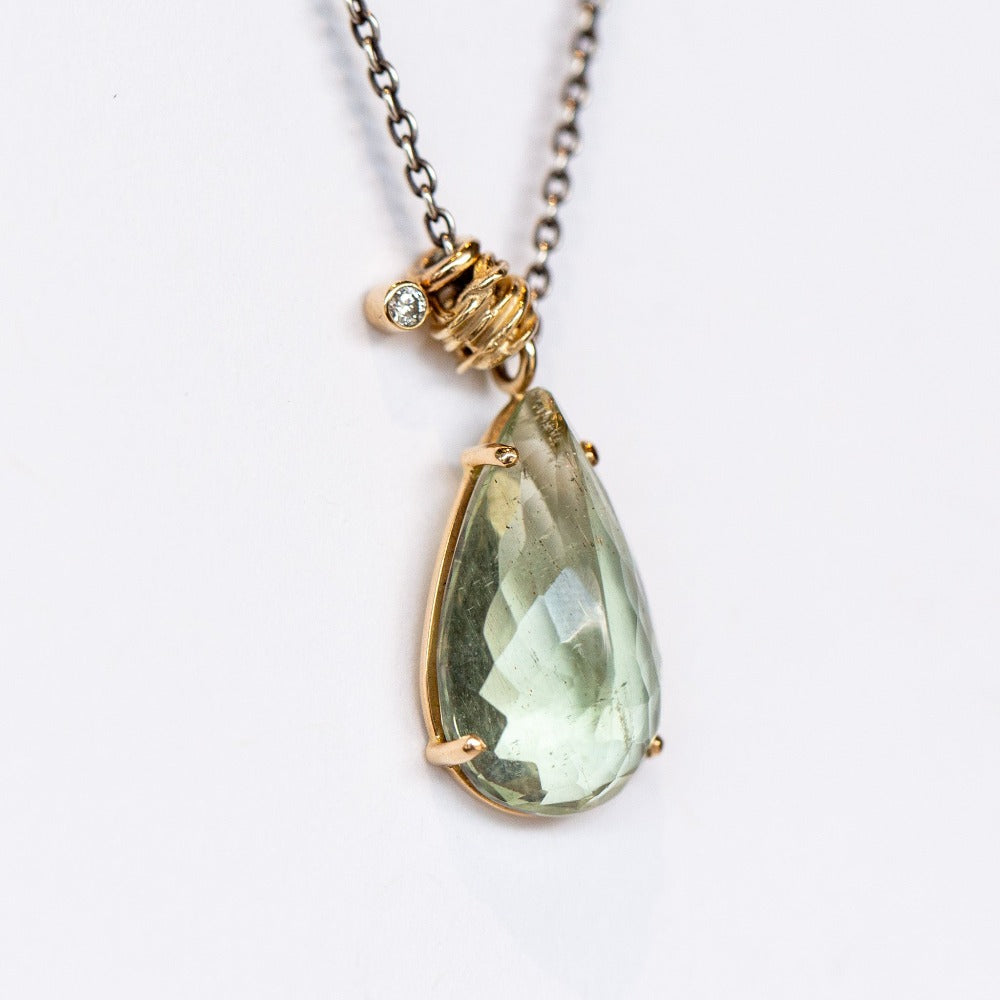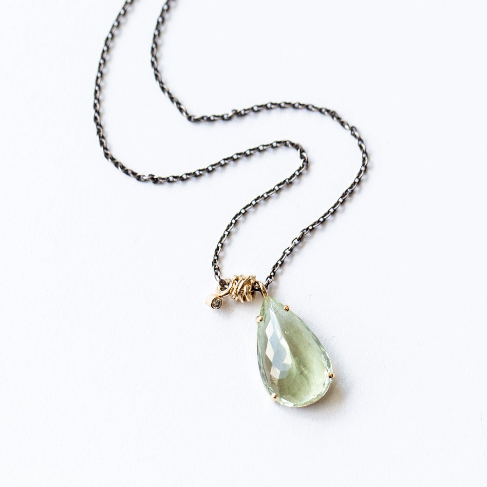 The Jamie Joseph Teardrop Green Beryl Necklace features a shimmering inverted, faceted green beryl gemstone set in 14k yellow gold, with an oxidized sterling silver chain for contrast. The striking teardrop shape of the green beryl is complemented by its faceted cut, which catches and reflects light, creating a subtle yet sophisticated glow. The Gemstone is accented by tiny gold rings and one petite diamond charm.