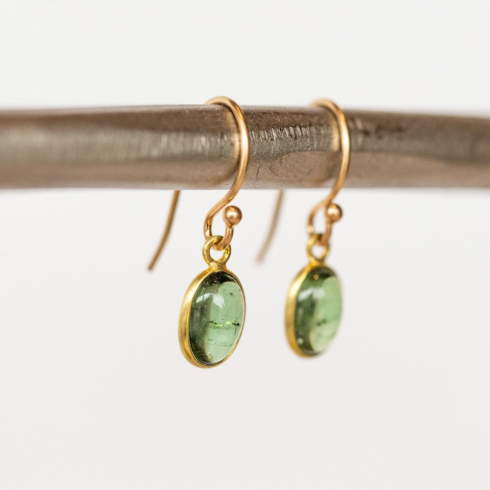 Oval cabochon green tourmaline drop earrings bezel set in 18k yellow gold