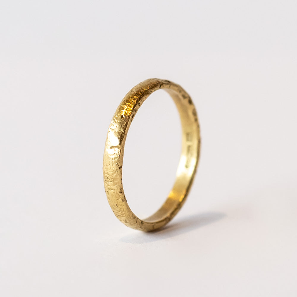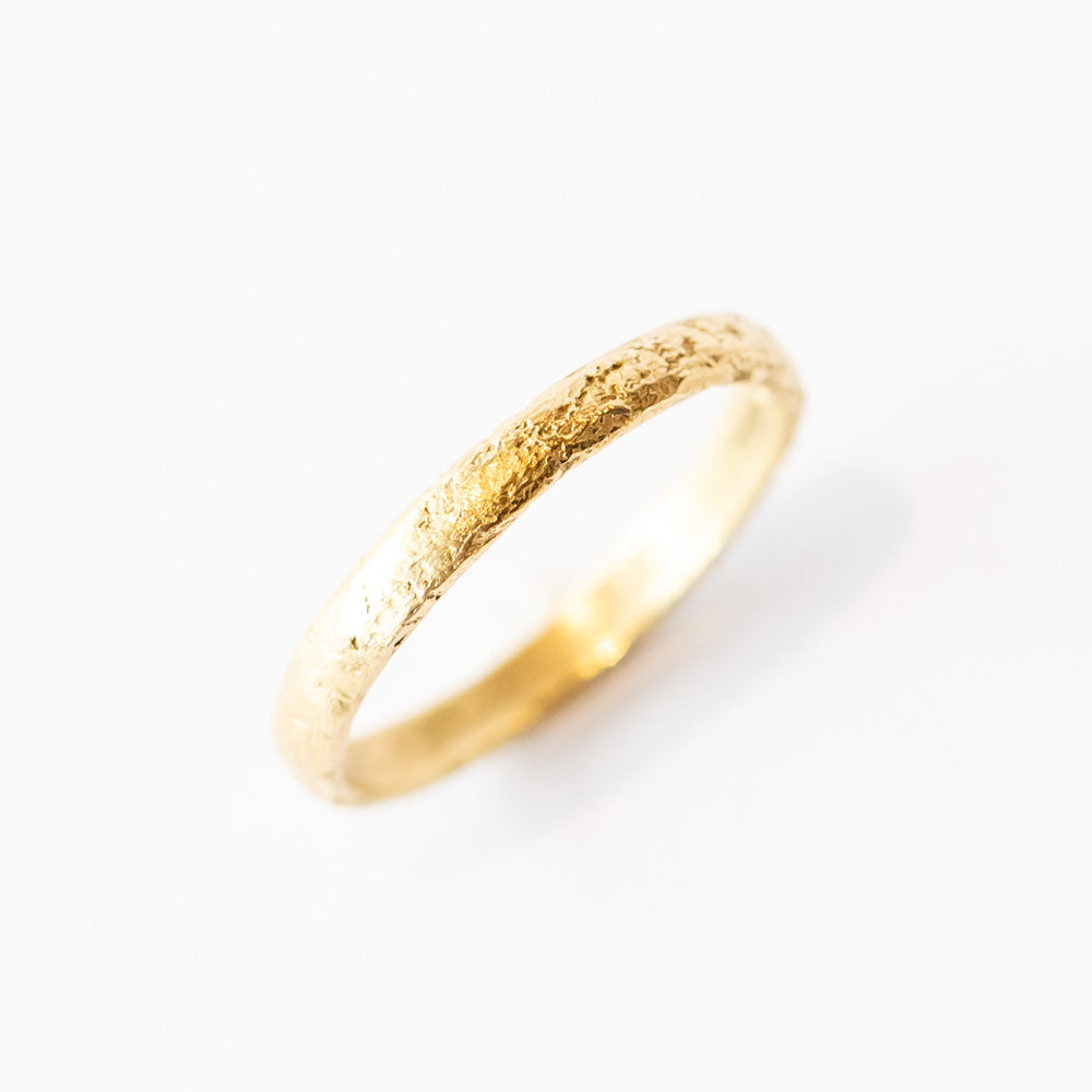 This 18k yellow gold half-round band has a beautifully organic texture—like molten gold cooled in all the right ways. No two are exactly alike, making it the perfect piece for those who love a little wild with their refined. Whether it’s a wedding band, a stacking ring, or your everyday signature piece, this one’s got effortless character built right in.