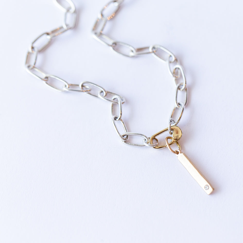 This heavy paperclip charm chain necklace from Jewelry by Cari is all about mixing edge with everyday elegance. The sterling silver chain brings that cool, modern vibe with its chunky paperclip links, while the handcrafted 14k yellow gold lobster clasp adds a luxe pop of warmth and shine.