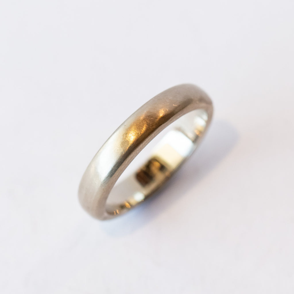 A substantial chunk of gold in the most perfectly imperfect 1/2 round profile to encircle your finger. A comfort fit polished interior and our signature semi-matte finish make for a simple yet unique wedding band choice.